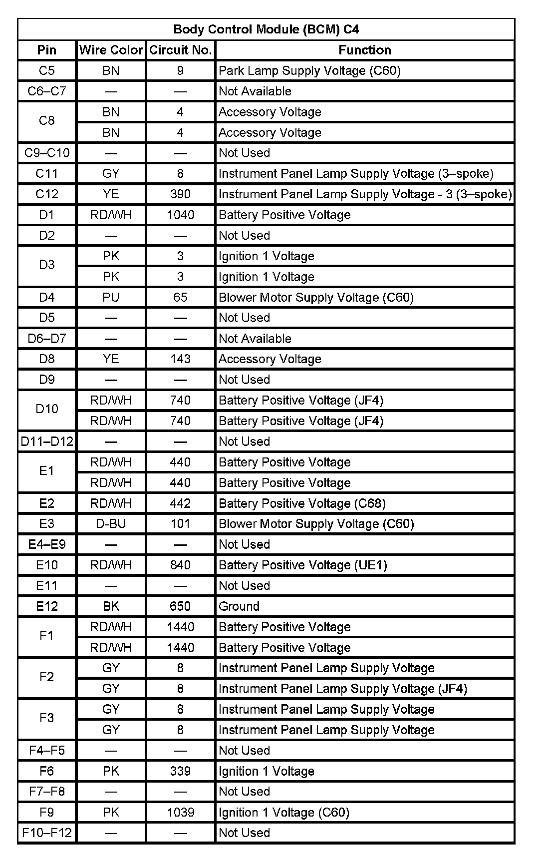 Body Control Module (BCM) C4 (Pin C5 To F12):