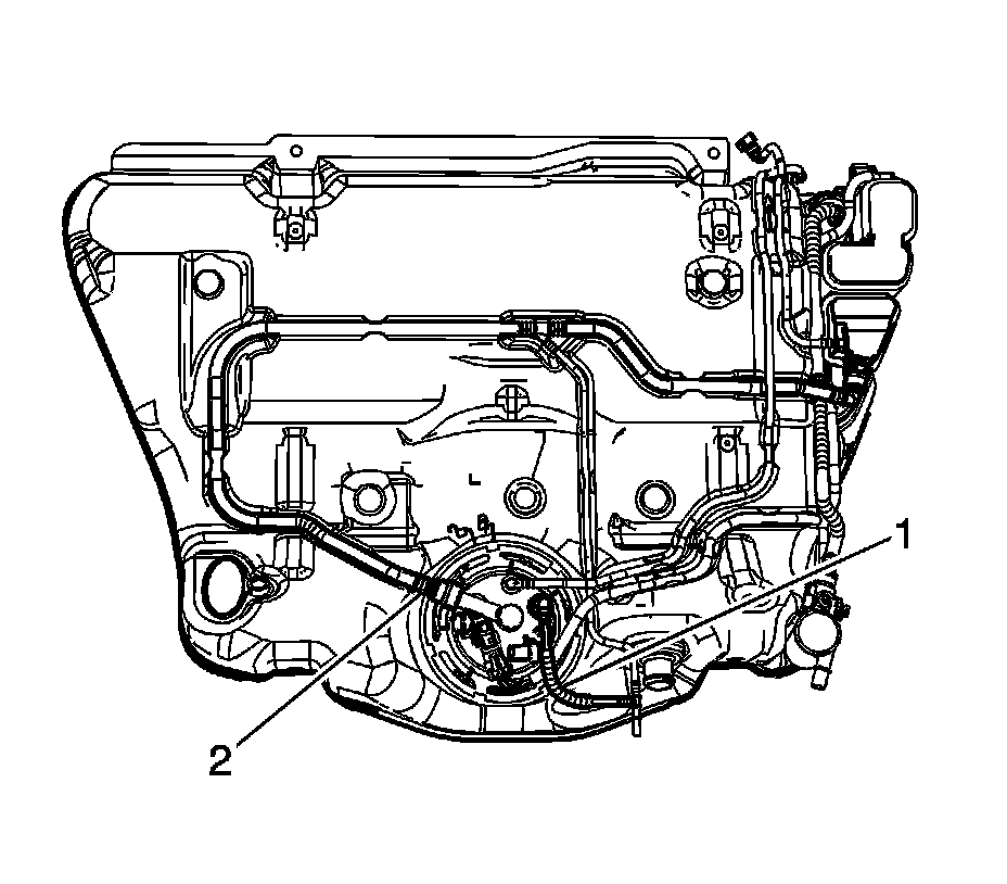 2. Install the fuel sender assembly (2) into the fuel tank far enough to connect the vapor line quick connect fitting on the underside of the sender cover.