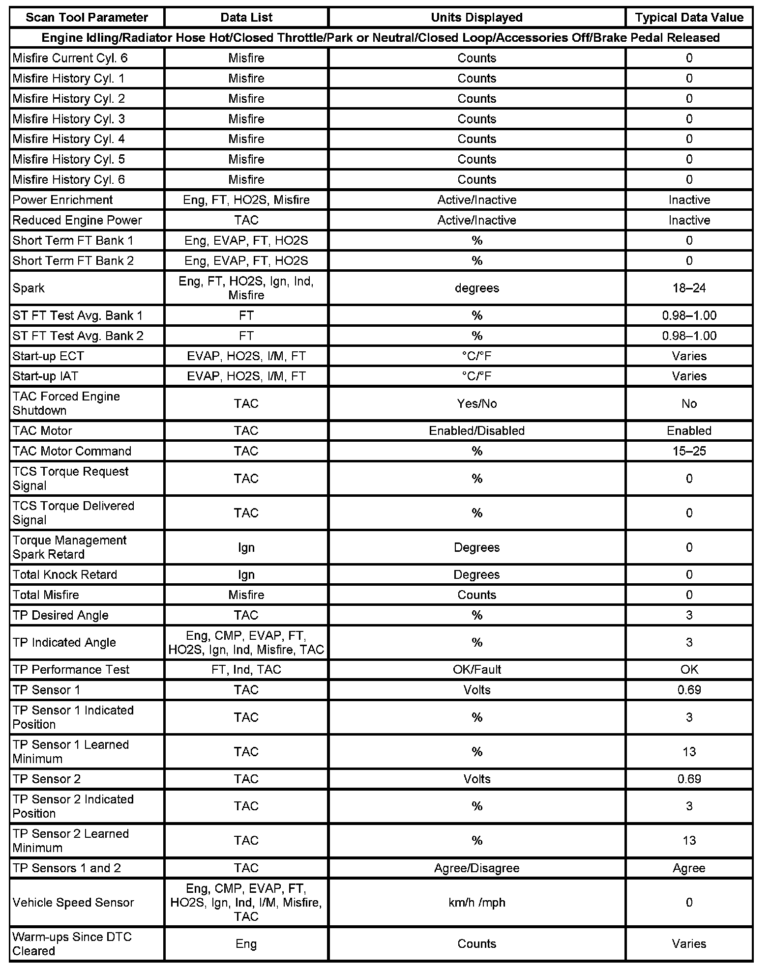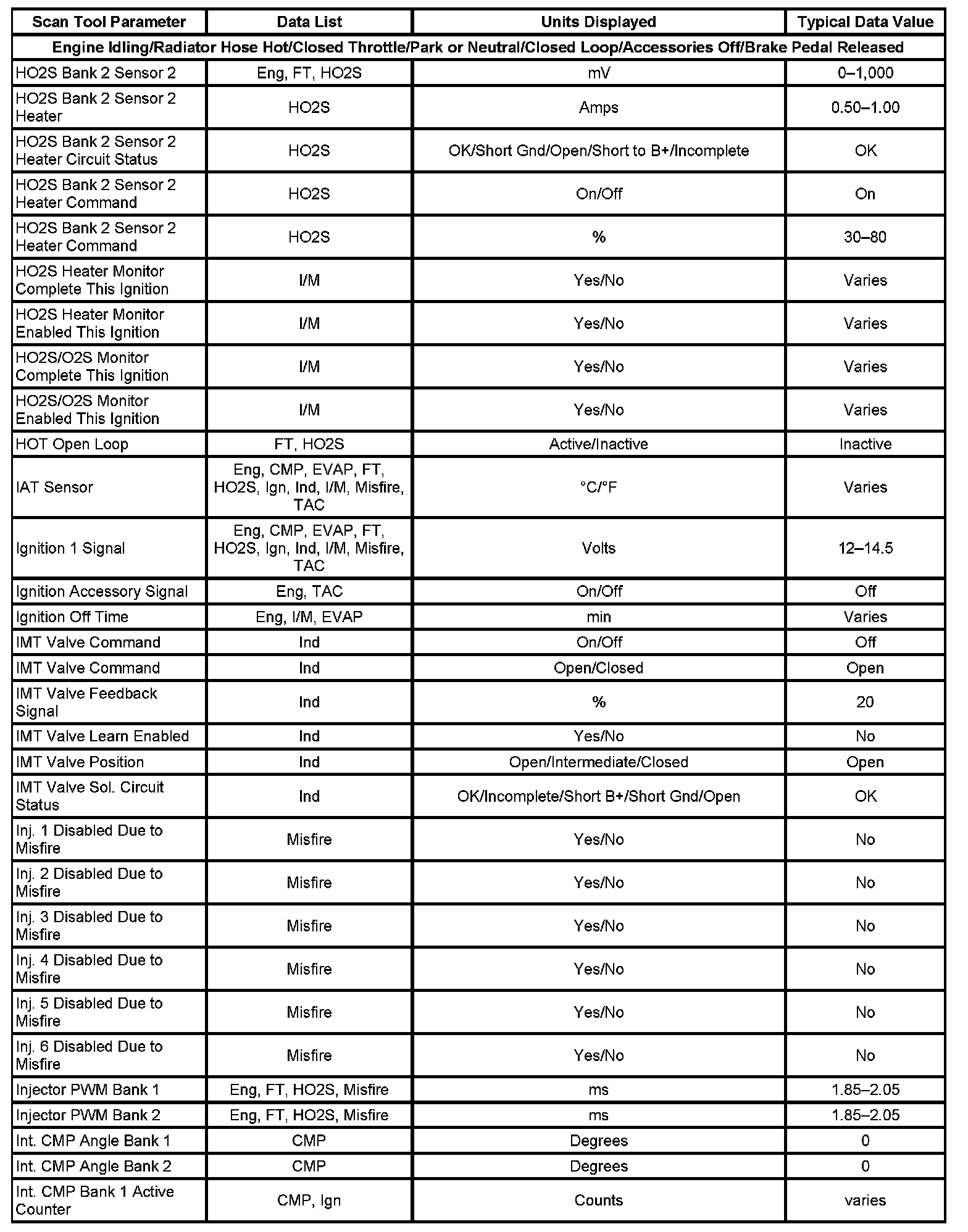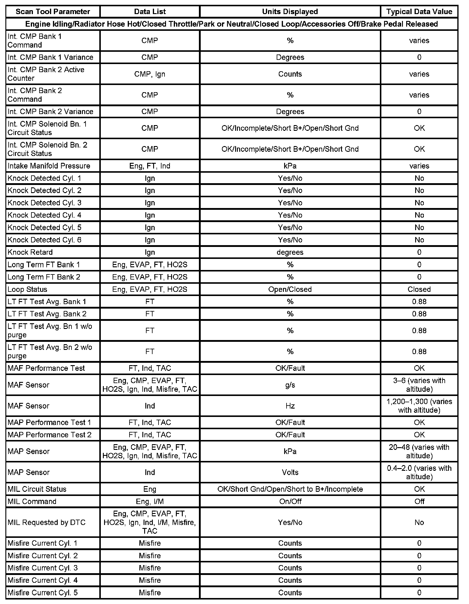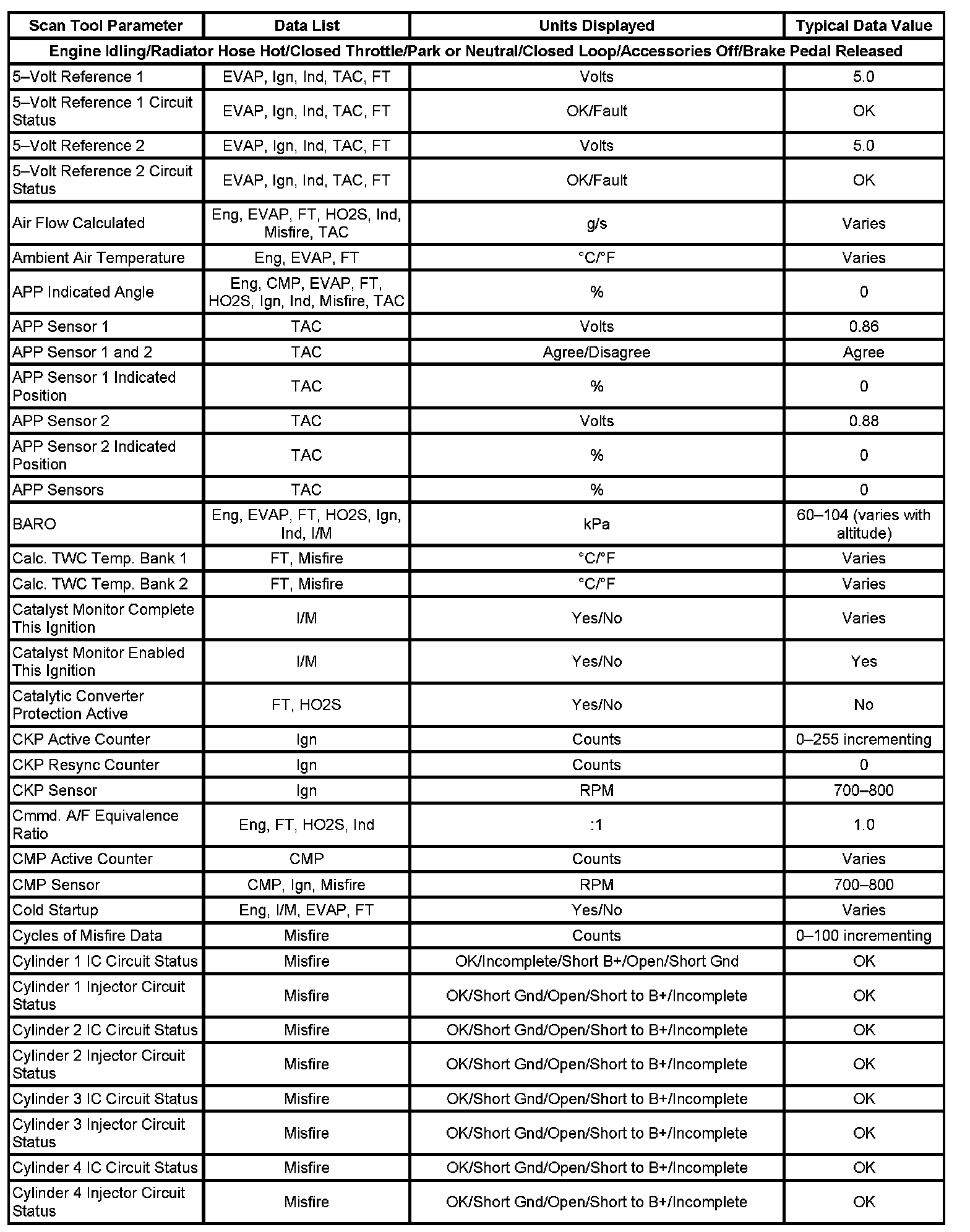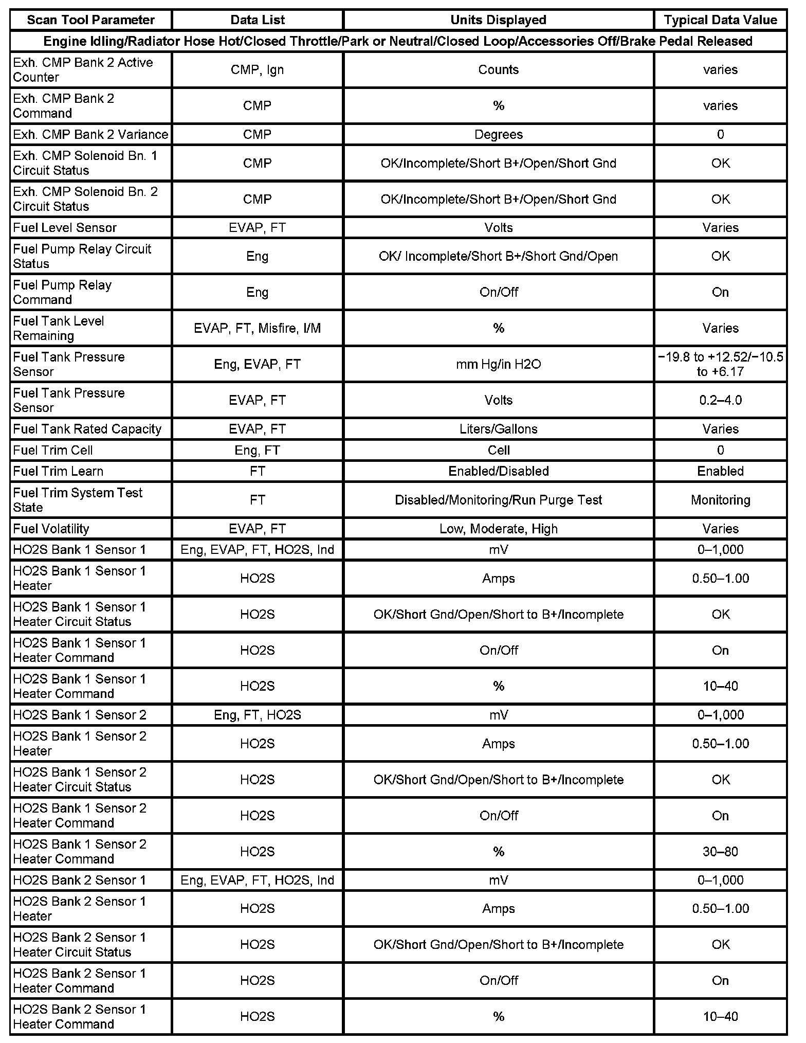 The Engine Scan Tool Data List contains all engine controls-related parameters that are available on the scan tool. The list is arranged in alphabetical order. A given parameter may appear in any one of the data lists, and in some cases may appear more than once, or in more than one data list in order to group certain related parameters together.
