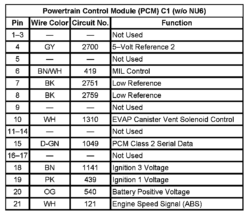 Powertrain Control Module (PCM) C1 (w/o NU6) (Pin 1 To 21):