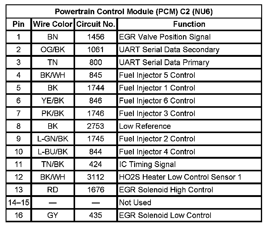 Powertrain Control Module (PCM) C2 (NU6) (Pin 1 To 16):