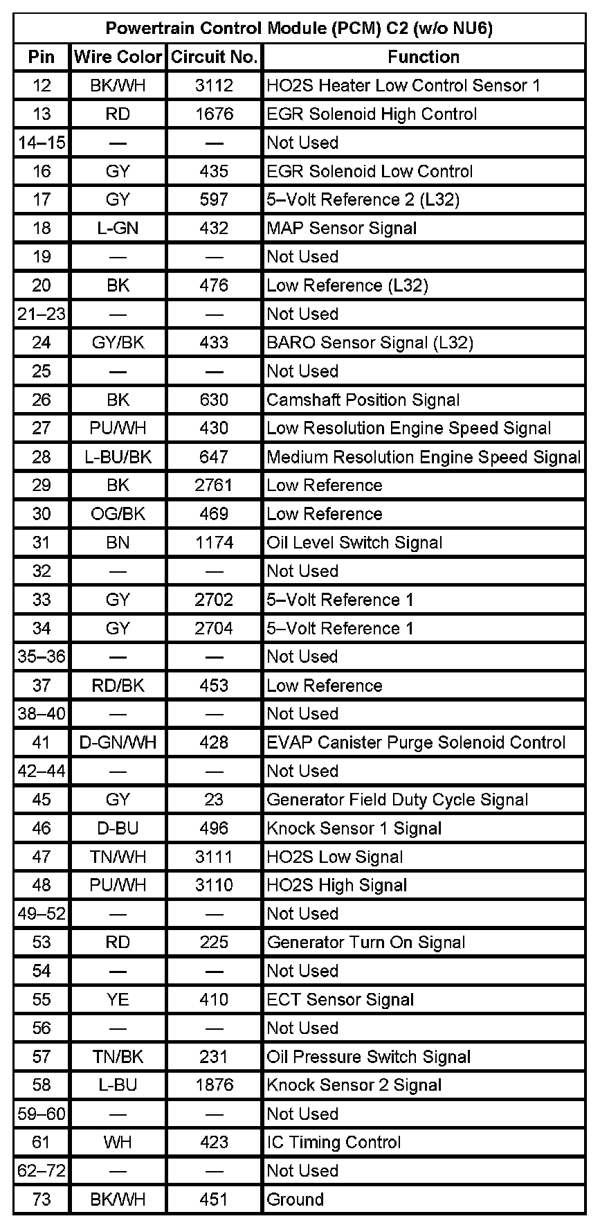 Powertrain Control Module (PCM) C2 (w/o NU6) (Pin 12 To 73):