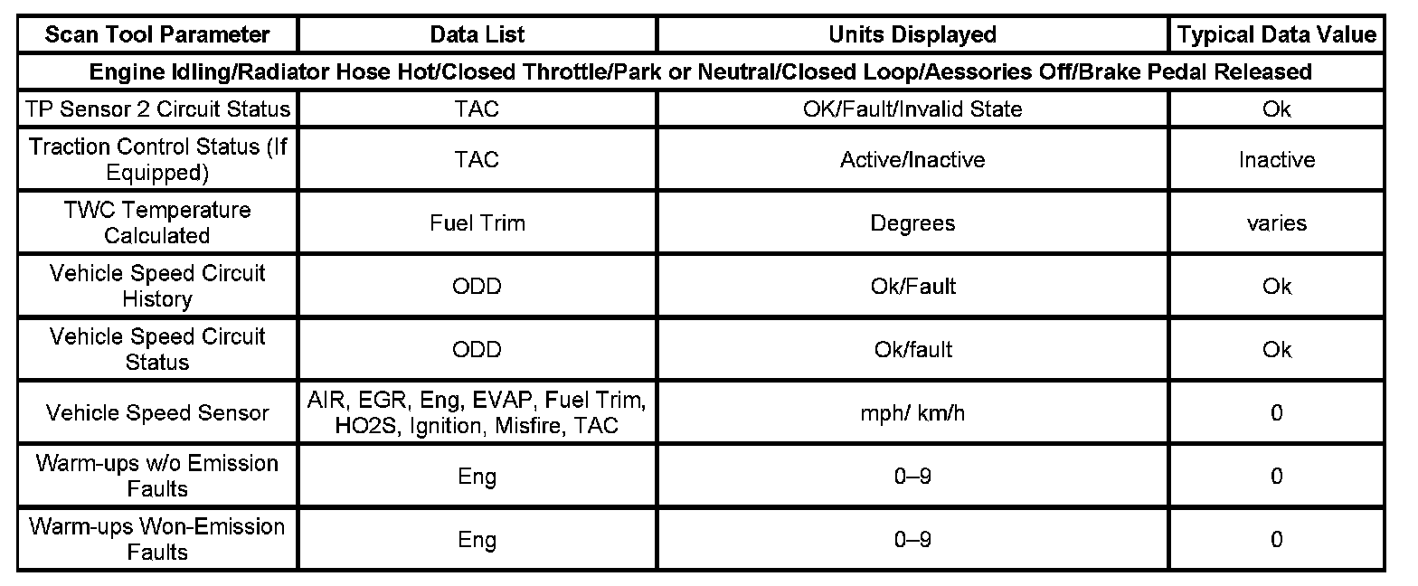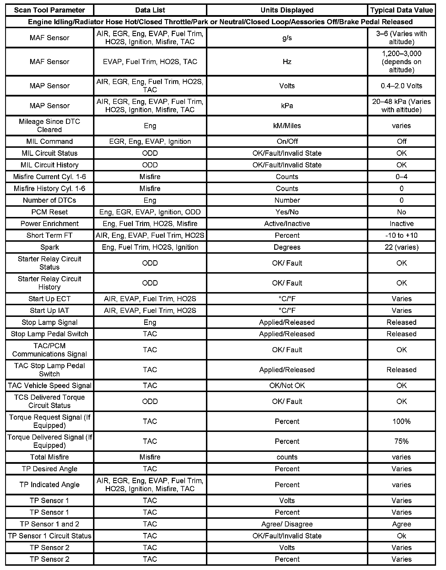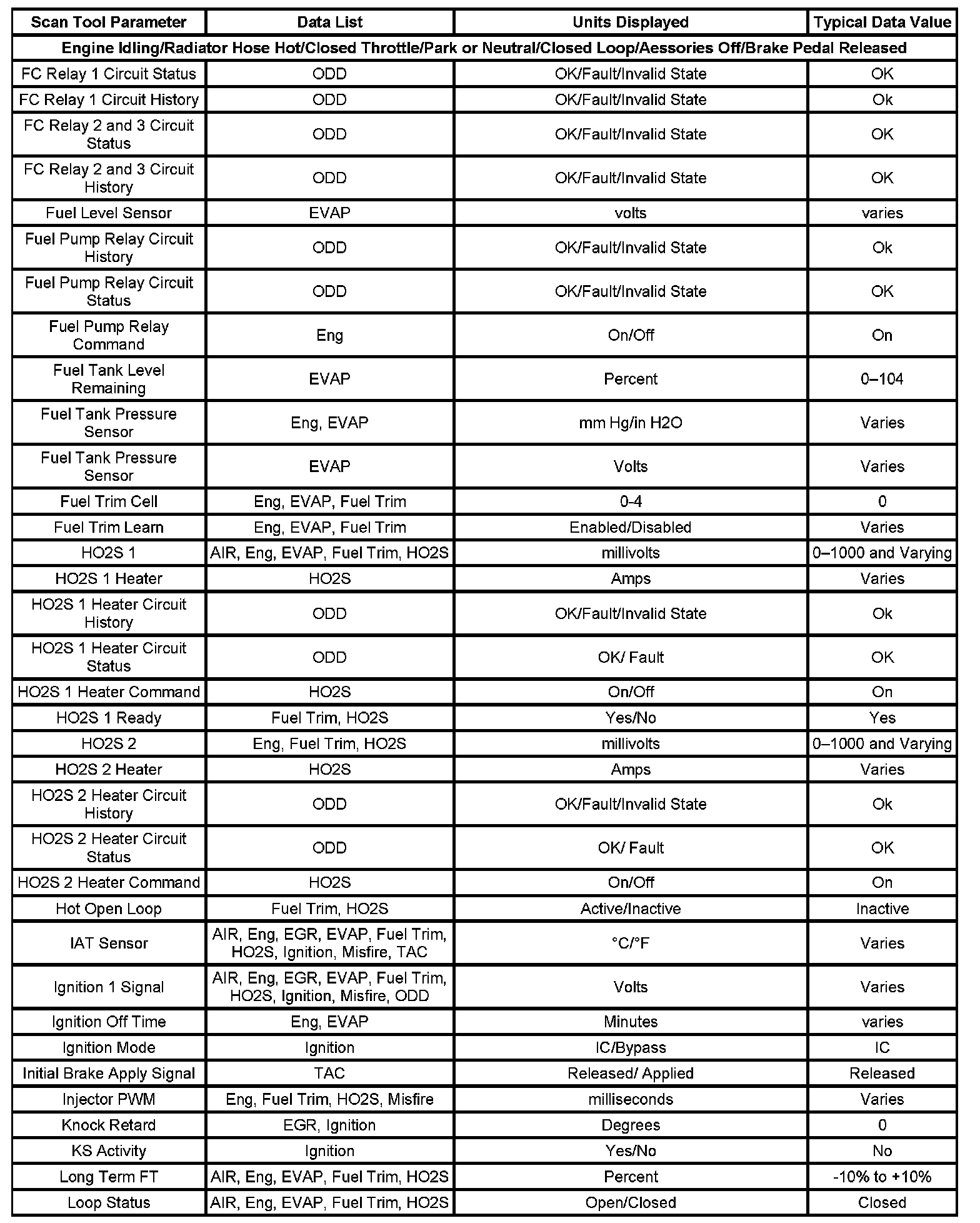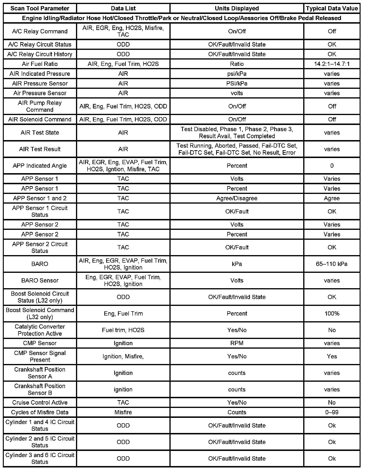 The Engine Scan Tool Data List contains all engine-related parameters that are available on the scan tool. The list is arranged in alphabetical order. A given parameter may appear in any one of the data lists, and in some cases may appear more than once, or in more than one data list in order to group certain related parameters together.