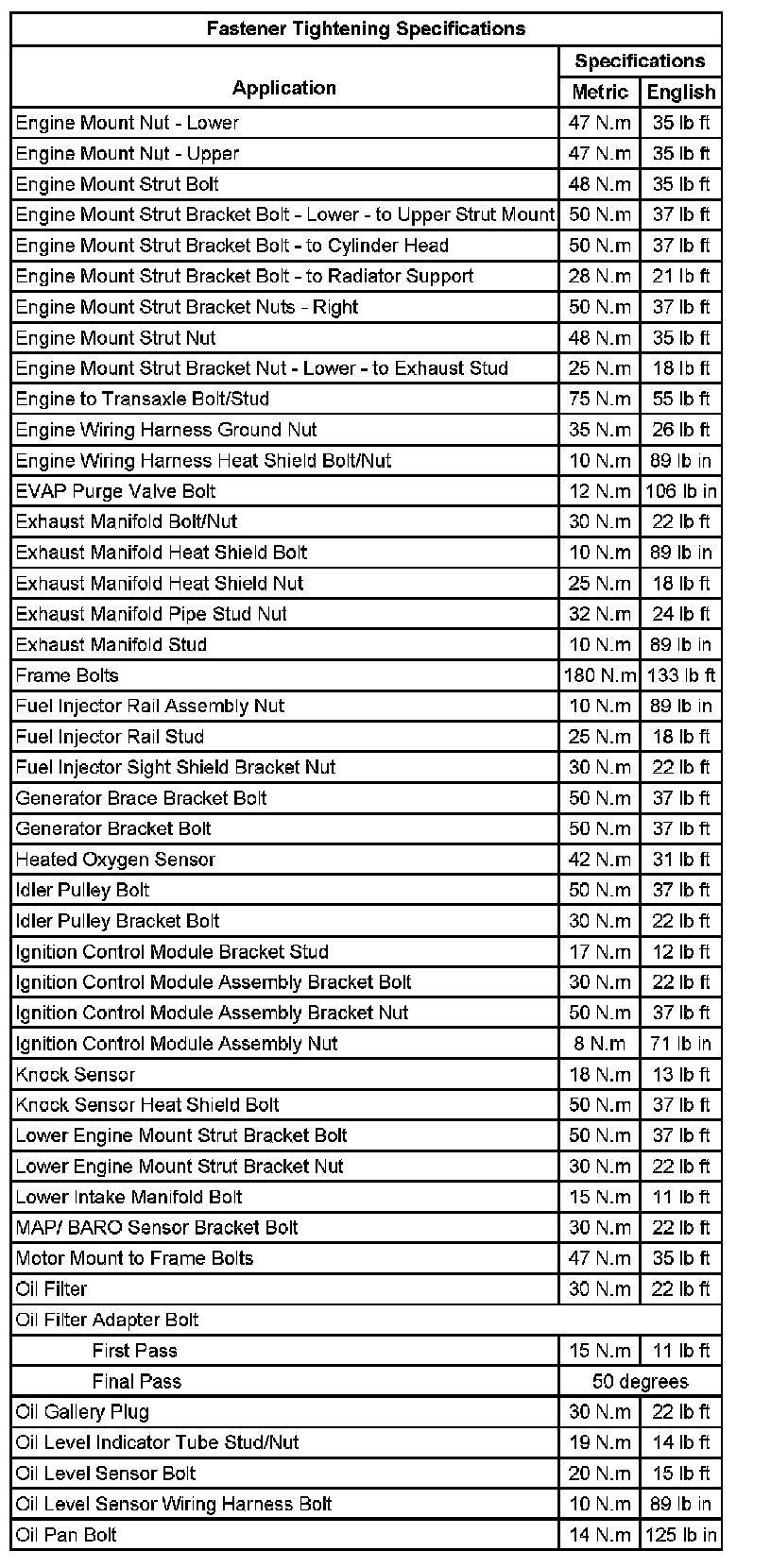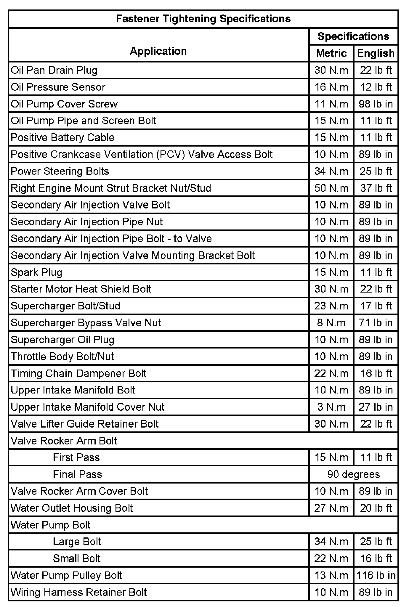 Fastener Tightening Specifications: