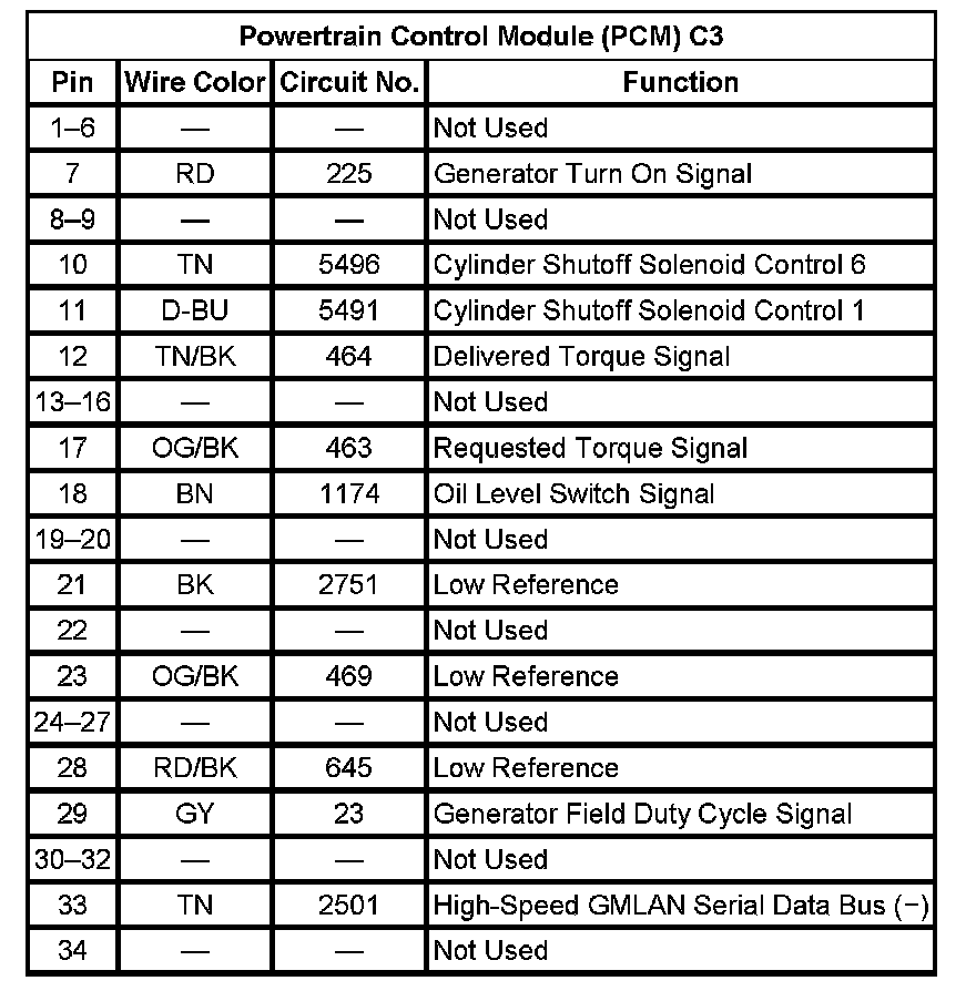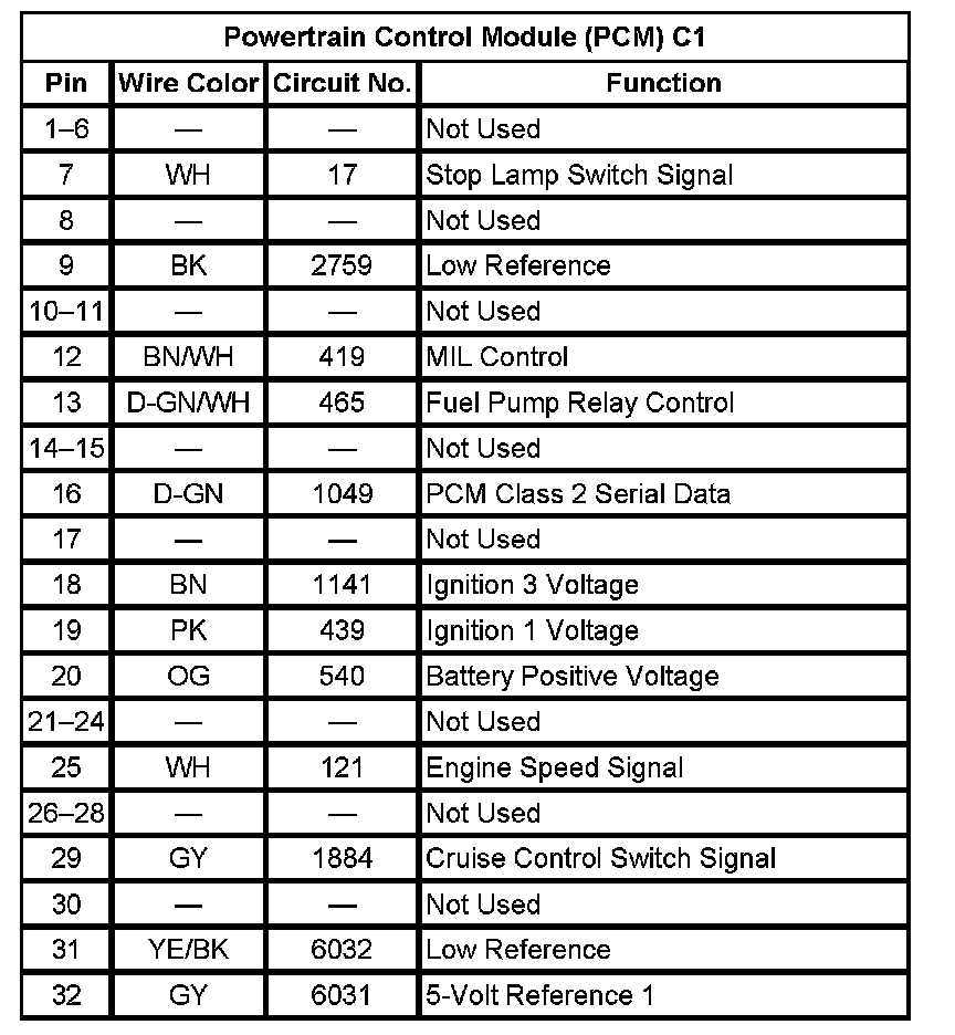 Powertrain Control Module (PCM) C1 (Pin 1 To 32):