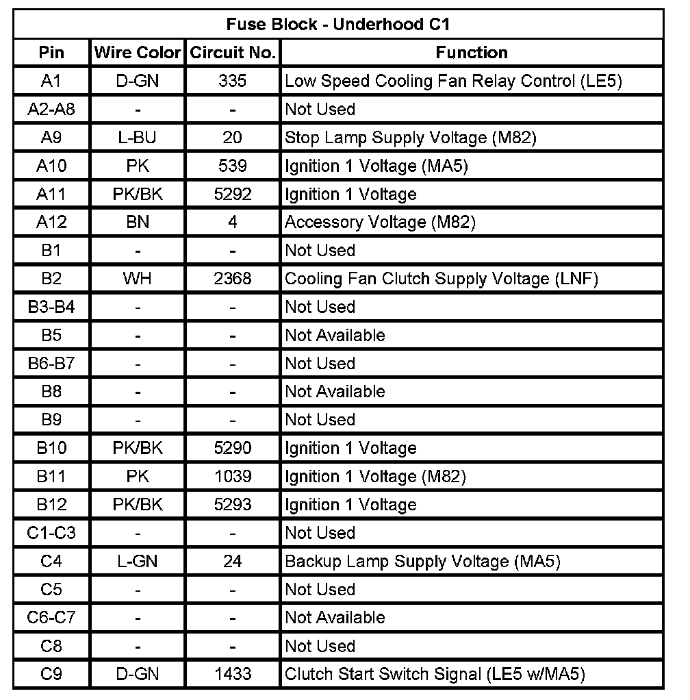 Fuse Block - Underhood C1 (Pin A1 To C9):
