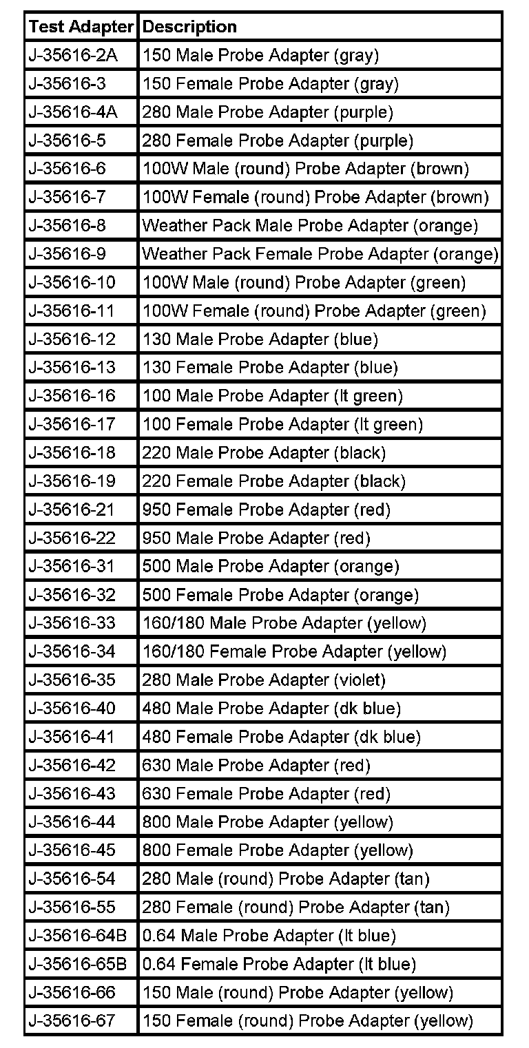 Important: When probing female 0.64 terminals, it is important to use the correct adapter. There have been some revisions to the test adapter for 0.64 terminals. The proper adapter for 0.64 terminals is thej35616-64B which has a gold terminal and a black wire between the base and tip. Failure to use the proper test adapter may result in damage to the terminal being tested and improper diagnosis.