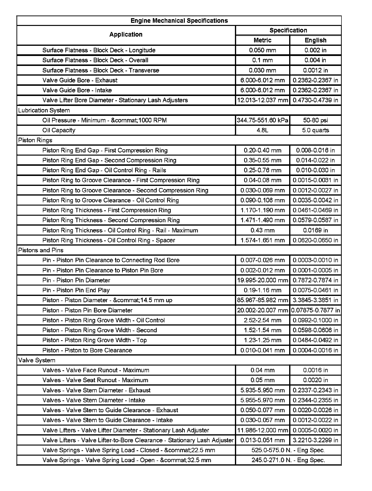 Engine Mechanical Specifications