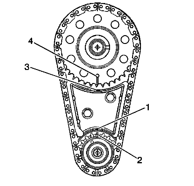 ^ Align the timing mark on the camshaft gear (4) with the timing mark on top of the timing chain dampener (3).