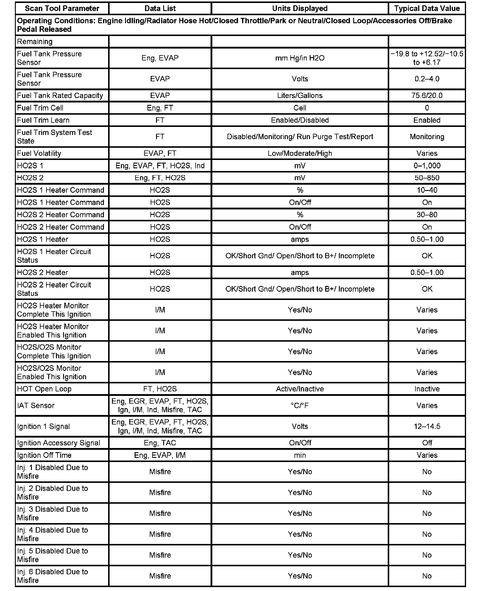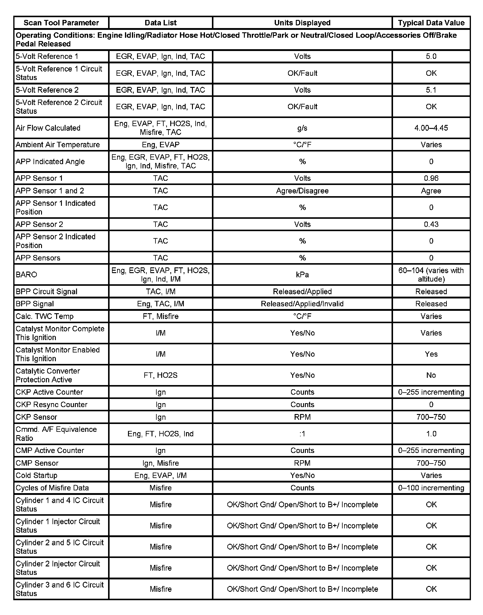 The Engine Scan Tool Data List contains all engine-related parameters that are available on the scan tool. The list is arranged in alphabetical order. A given parameter may appear in any one of the data lists, and in some cases may appear more than once, or in more than one data list in order to group certain related parameters together.