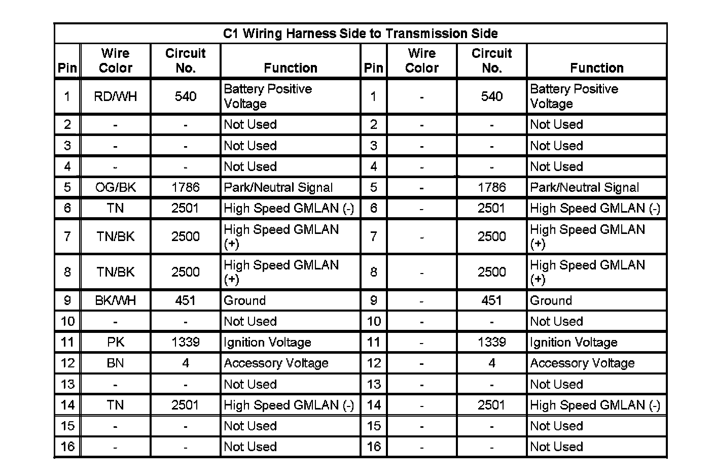 C1 Wiring Harness Side To Transmission Side: