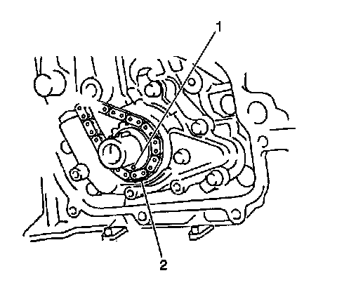 ^ Install the timing chain shoe. Secure the timing chain shoe using two bolts (1, 2).