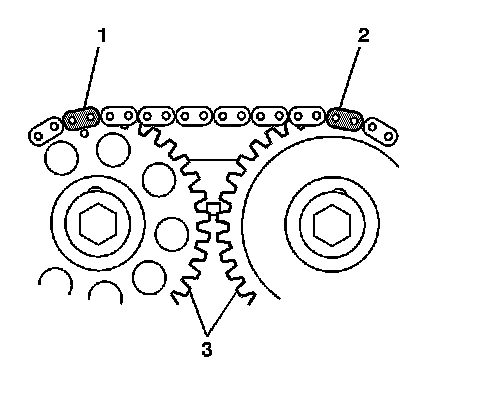 ^ Install the timing chain (1) onto the camshafts timing sprockets (3).