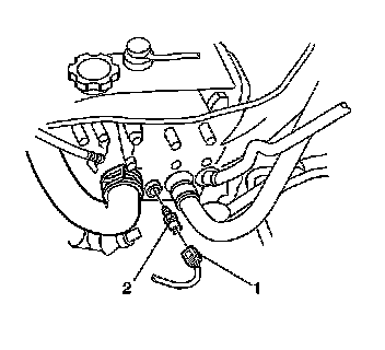 2. Disconnect the ECT sensor electrical connector (1) from the ECT sensor (2) located next to the upper radiator hose on the cylinder head.