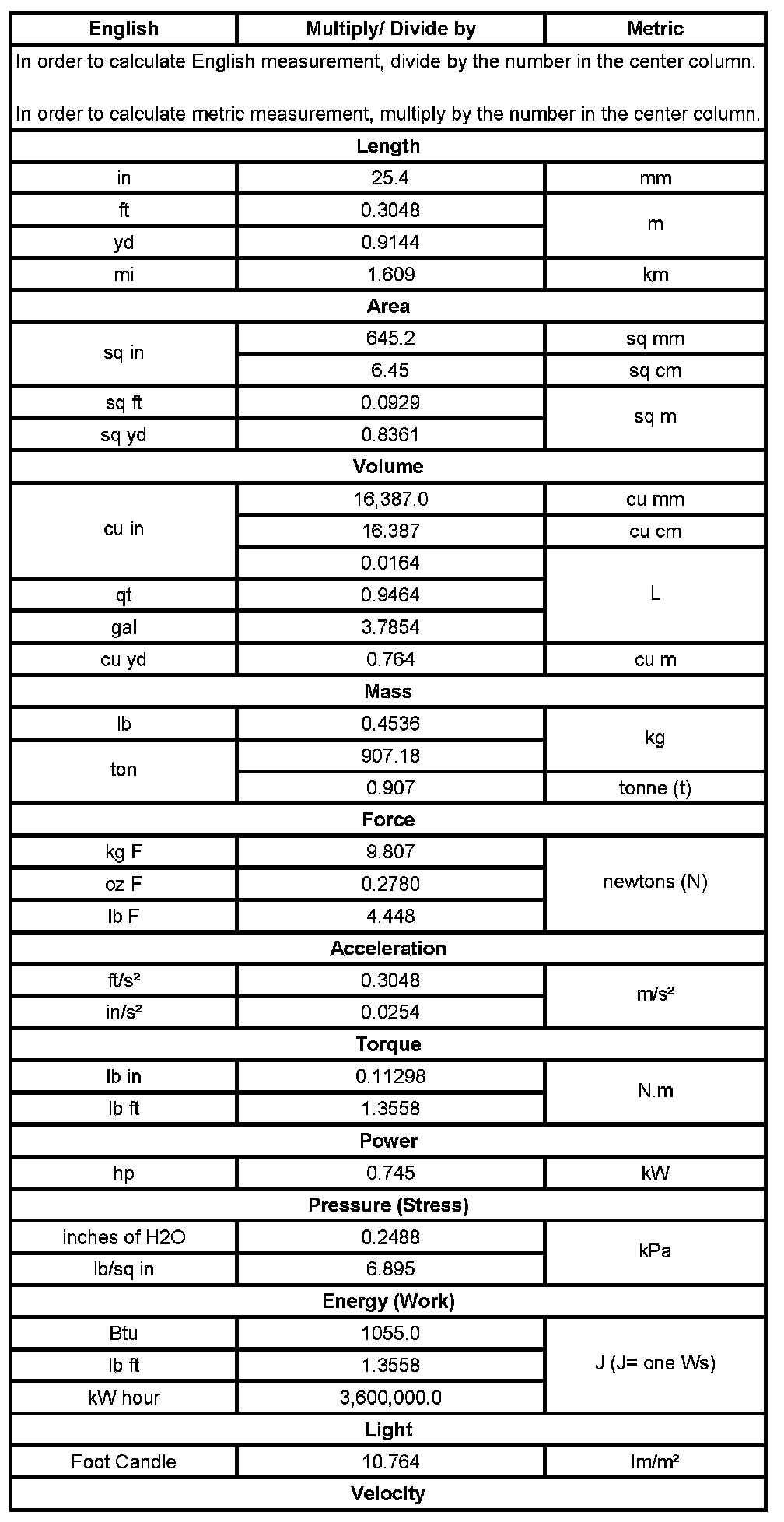 US English/Metric Conversion
