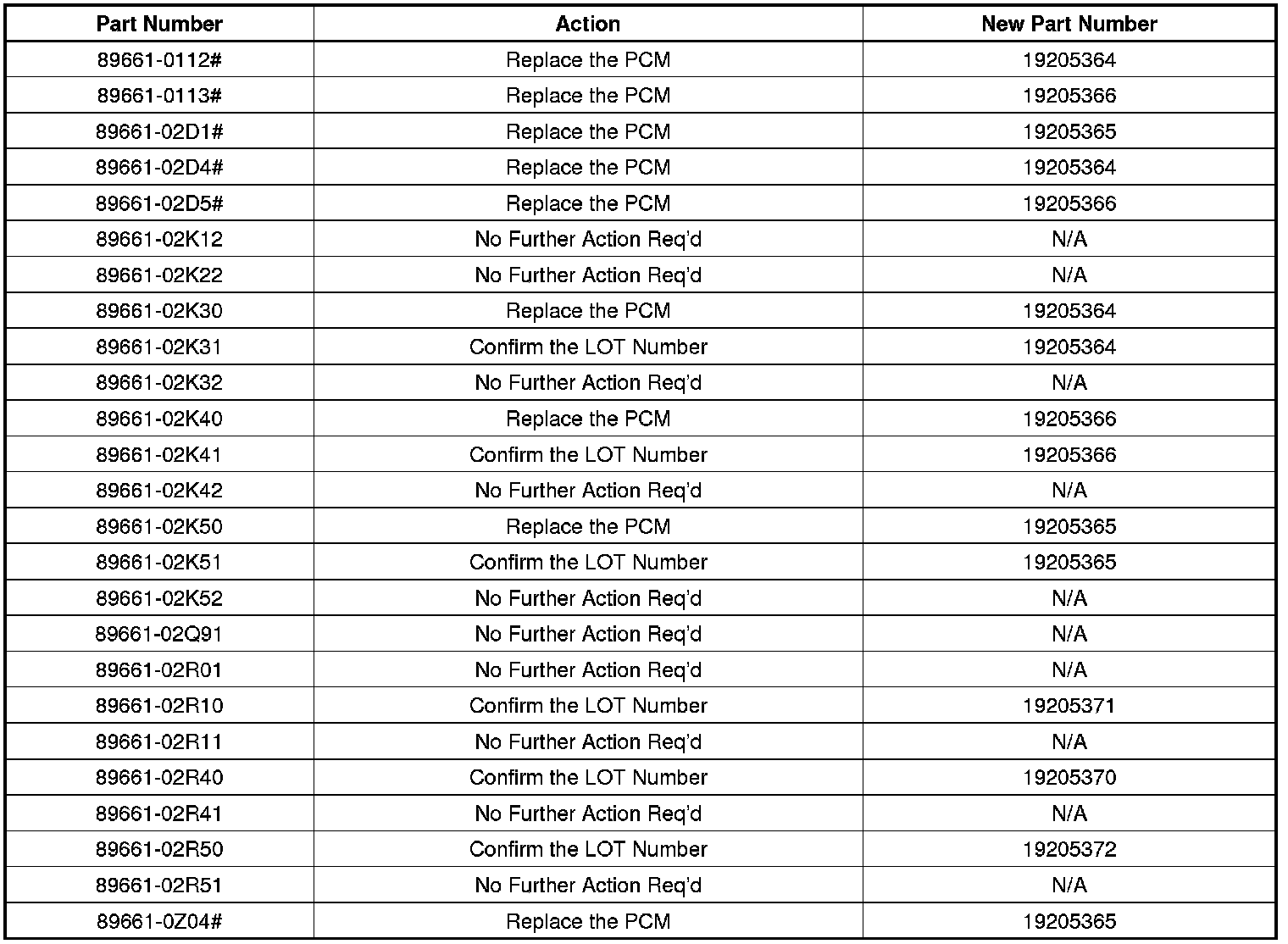 3. Confirm the PCM part number to determine the required action using the table below.