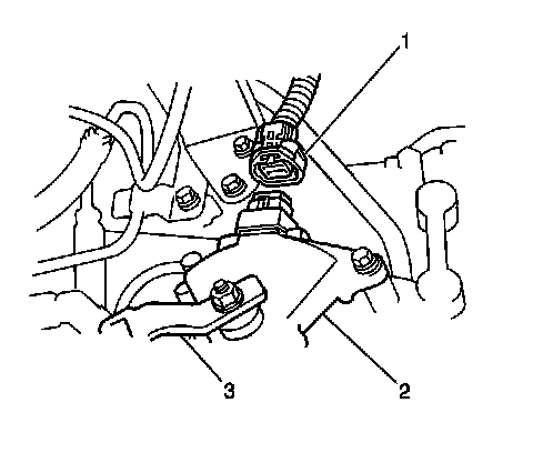 12. Install the shift select cable in the retaining bracket (2), then install the clip (3).