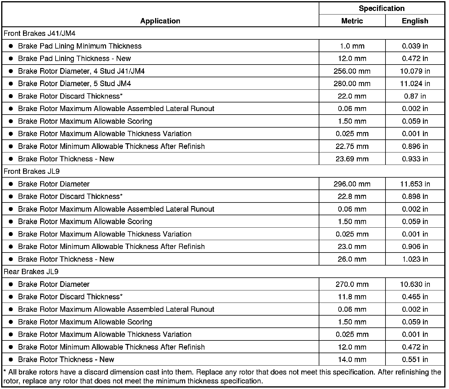 Disc Brake Component Specifications