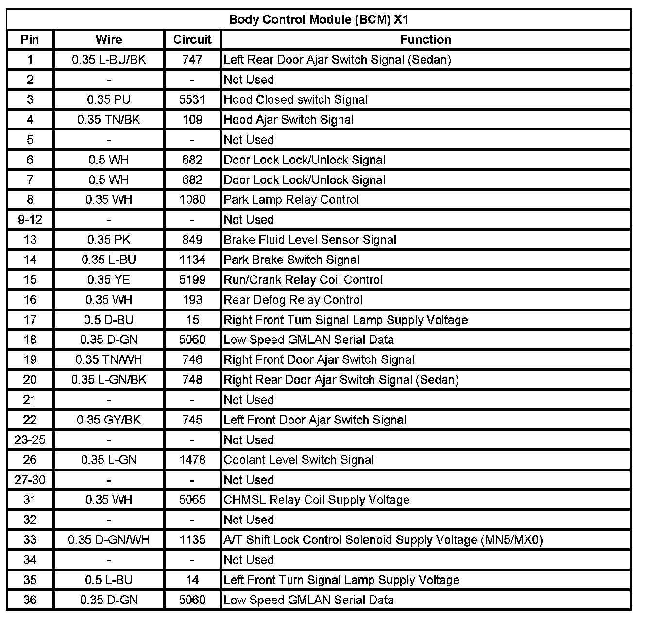 Body Control Module (BCM) X1 (Pin 1 To 36):