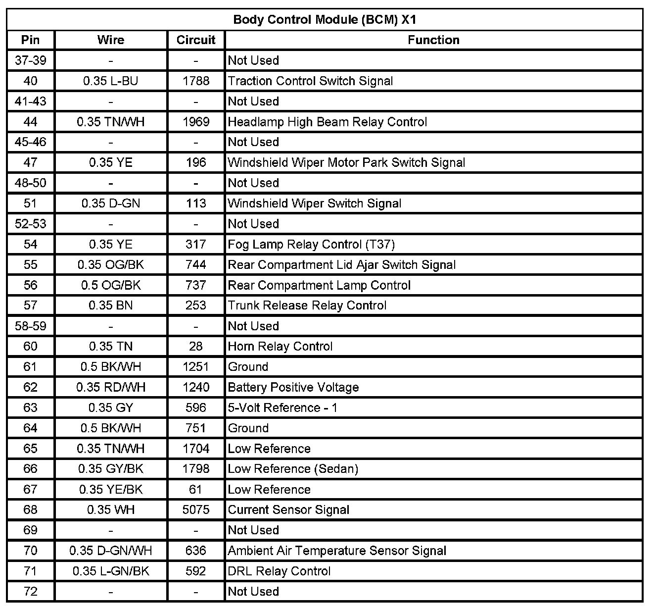 Body Control Module (BCM) X1 (Pin 37 To 72):