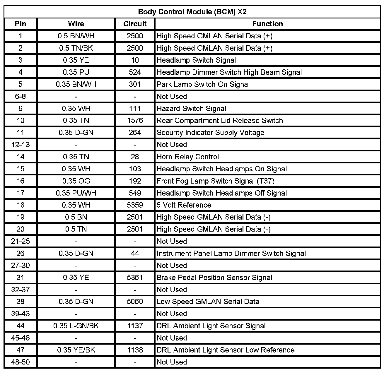 Body Control Module (BCM) X2 (Pin 1 To 50):