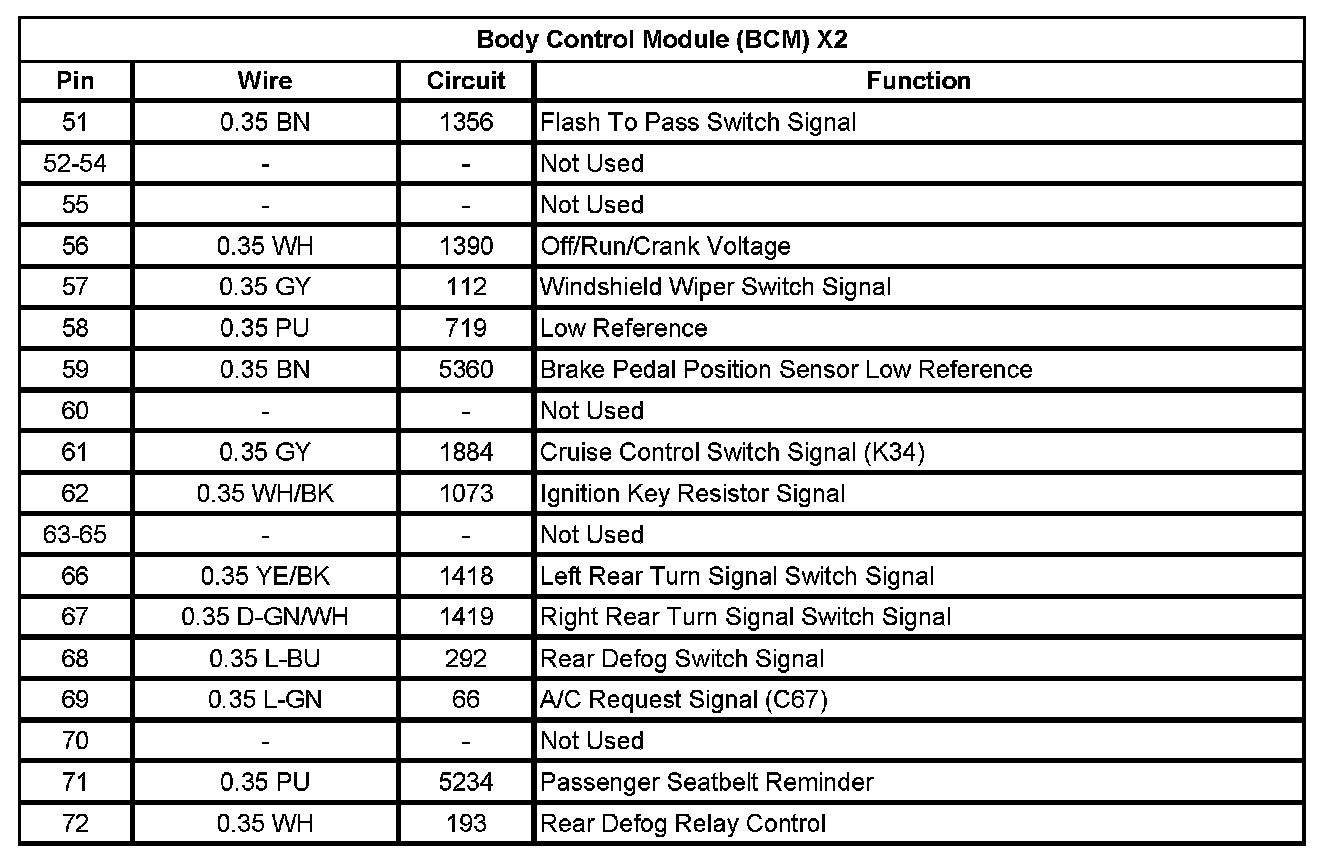 Body Control Module (BCM) X2 (Pin 51 To 72):
