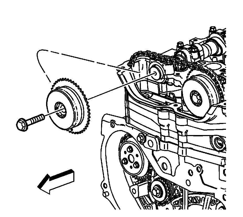^ Install the exhaust camshaft actuator onto the exhaust camshaft, aligning the dowel pin into the camshaft slot.