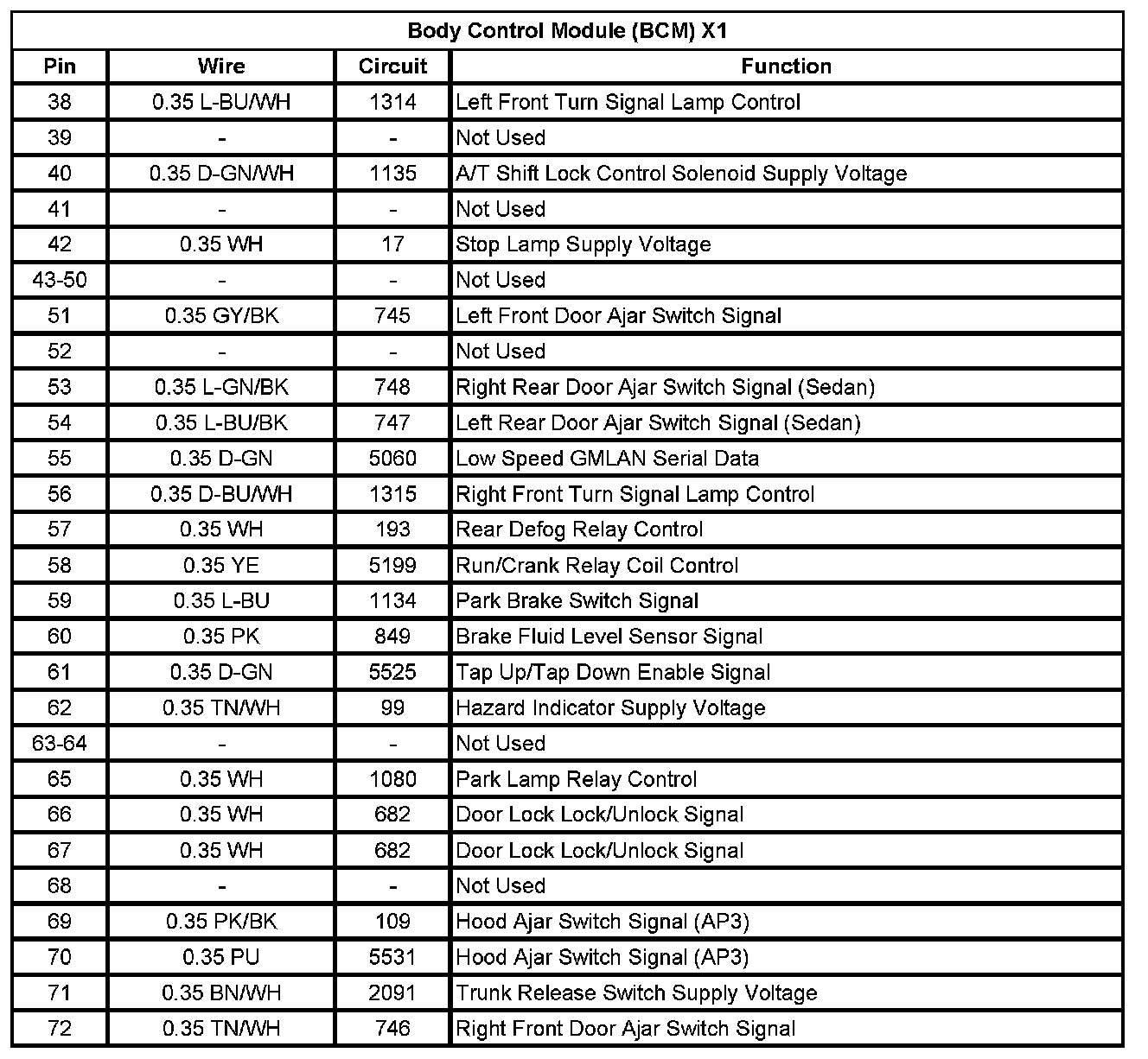 Body Control Module (BCM) X1 (Pin 38 To 72):