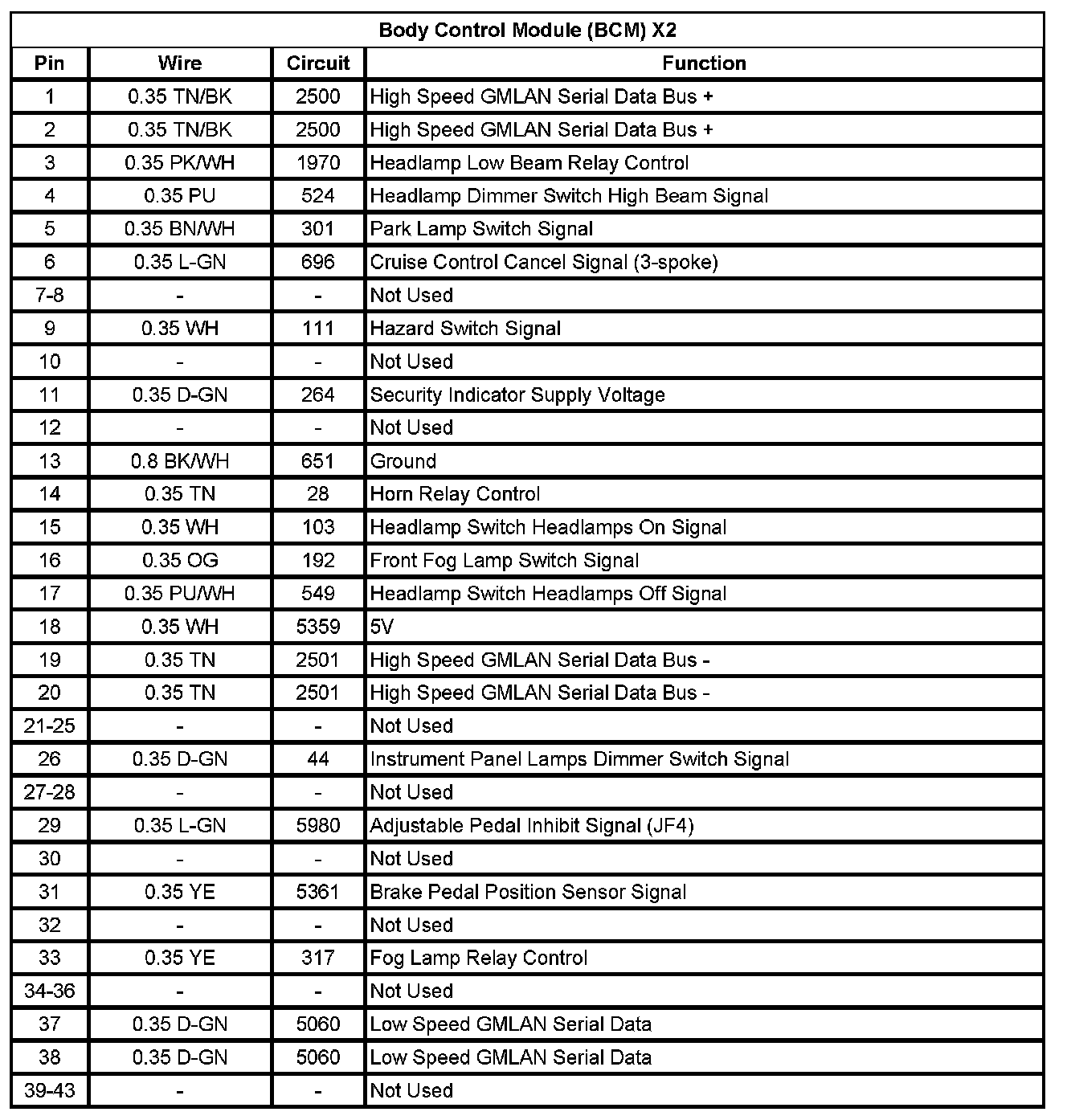 Body Control Module (BCM) X2 (Pin 1 To 43):