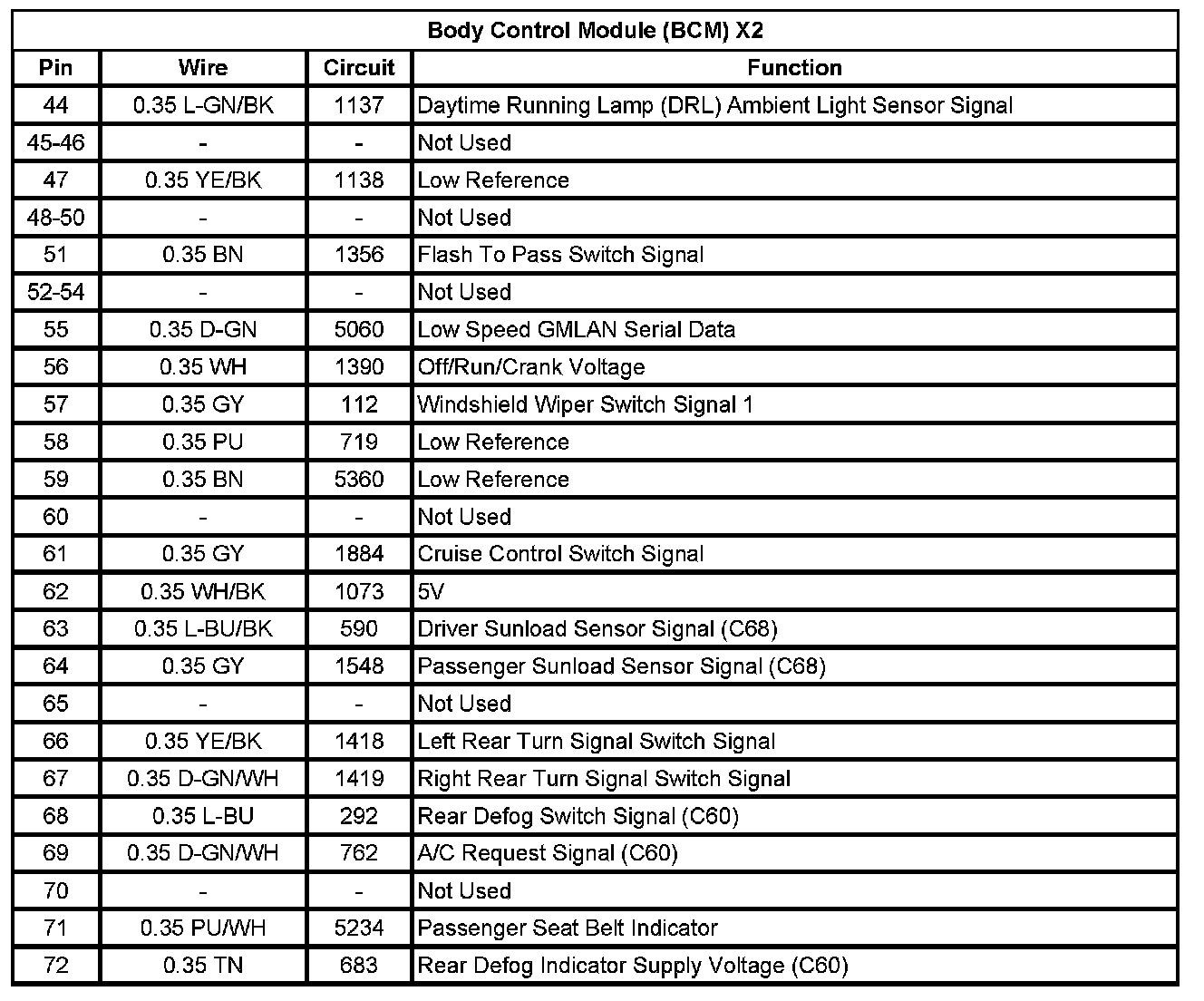 Body Control Module (BCM) X2 (Pin 44 To 72):