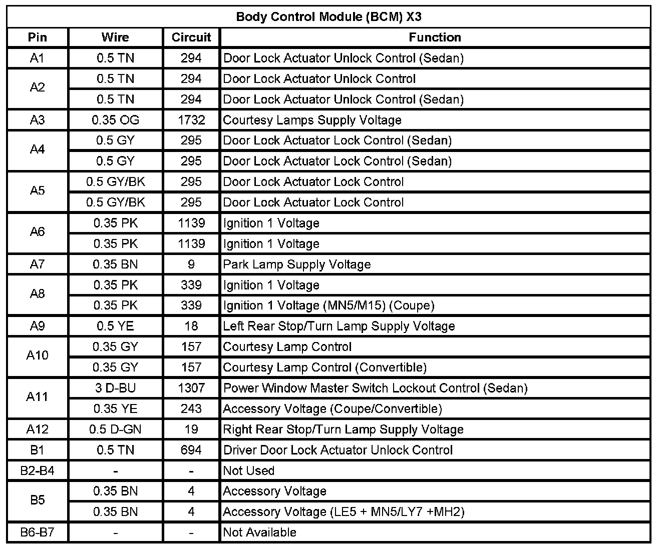 Body Control Module (BCM) X3 (Pin A1 To B7):