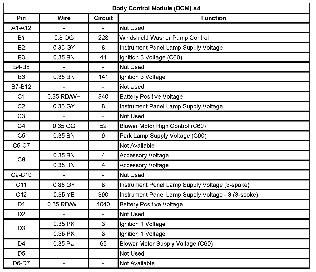 Body Control Module (BCM) X4 (Pin A1 To D7):