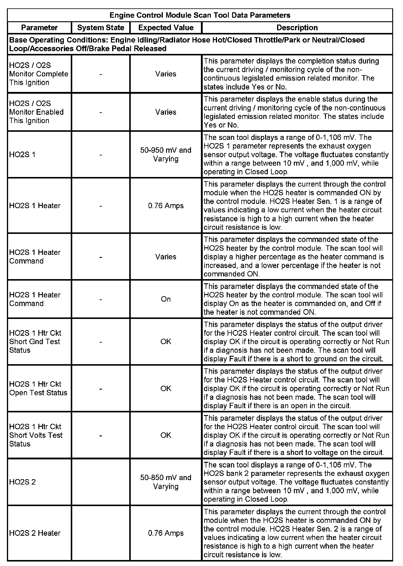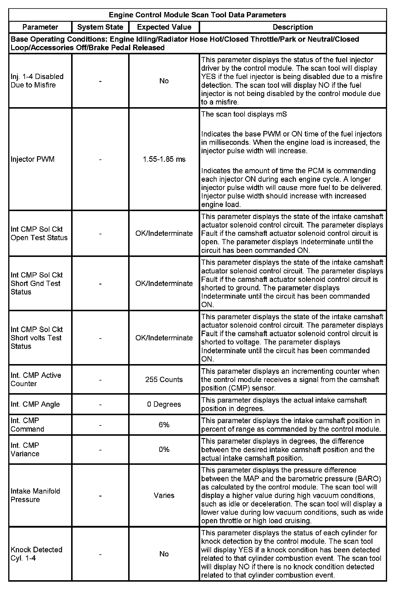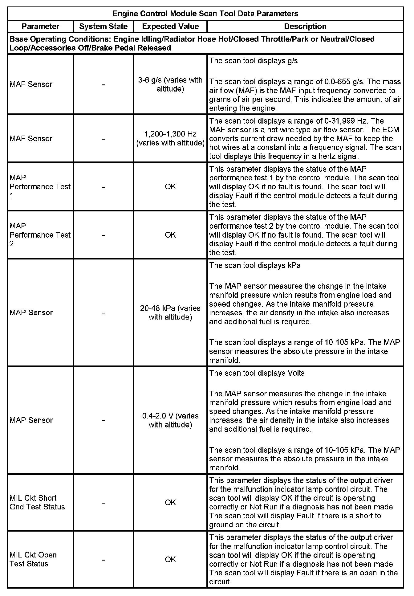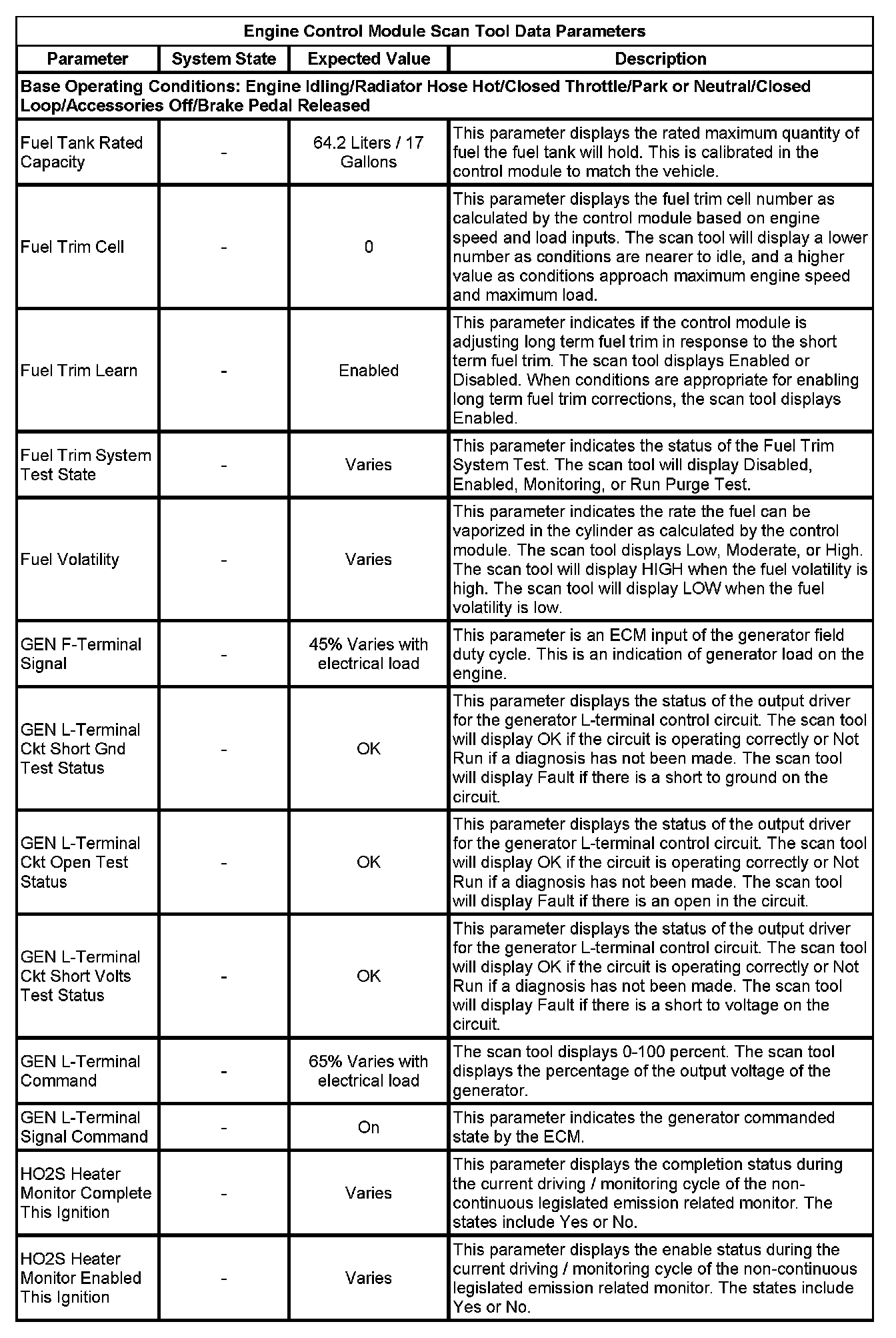 The scan tool values from a properly running engine may be used for comparison with the engine you are diagnosing. The Engine Scan Tool Data List represents values that would be seen on a normally running engine.