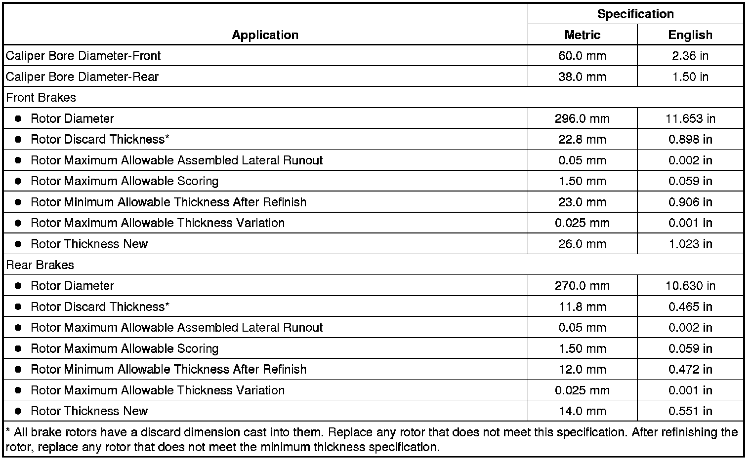 Disc Brake Component Specifications