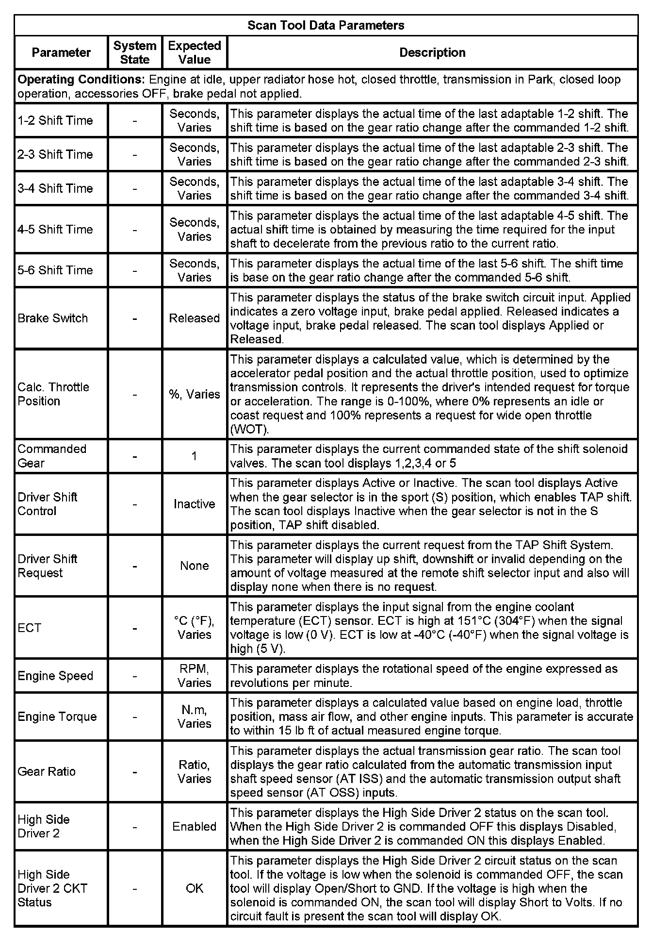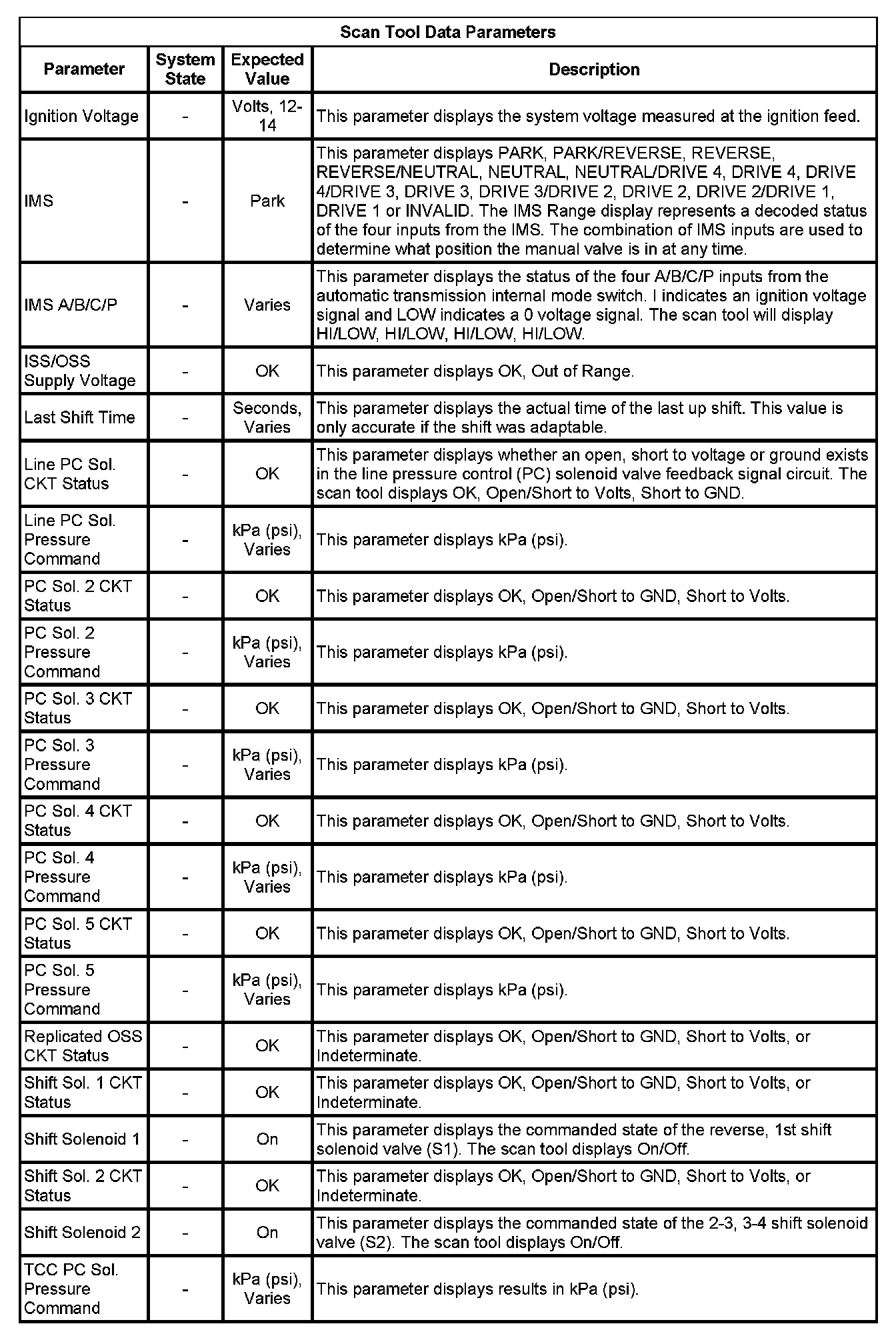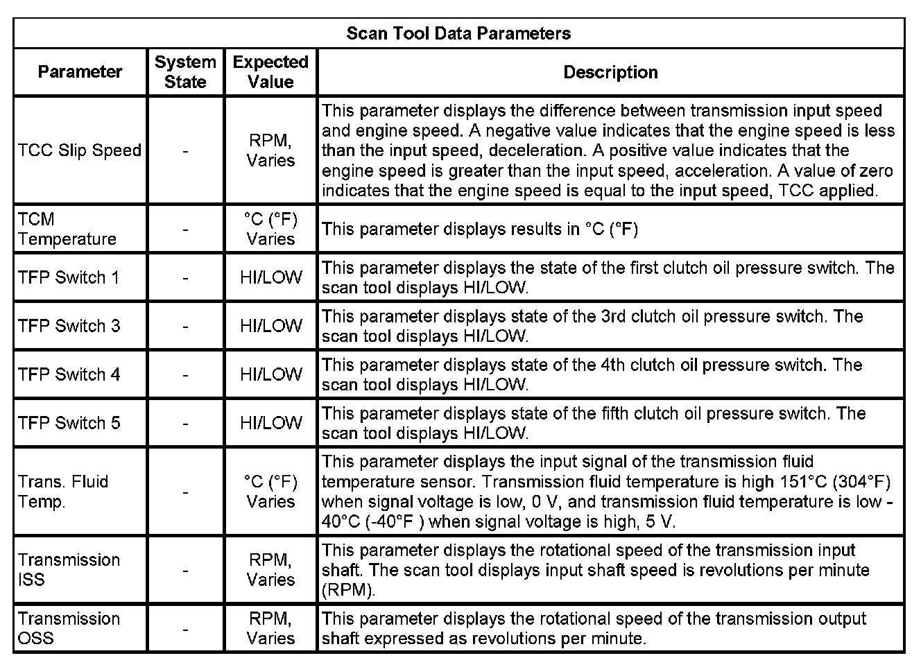 The Transmission Control Module Scan Tool Data List contains all transmission related parameters that are available on the scan tool. The list is arranged in alphabetical order. A given parameter may appear in any one of the data lists, and in some cases may appear more than once, or in more than one data list in order to group certain related parameters together.