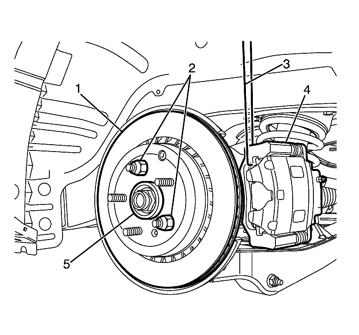 2.Remove the 2 wheel nuts (4) retaining the brake disc (3) to the hub (5).