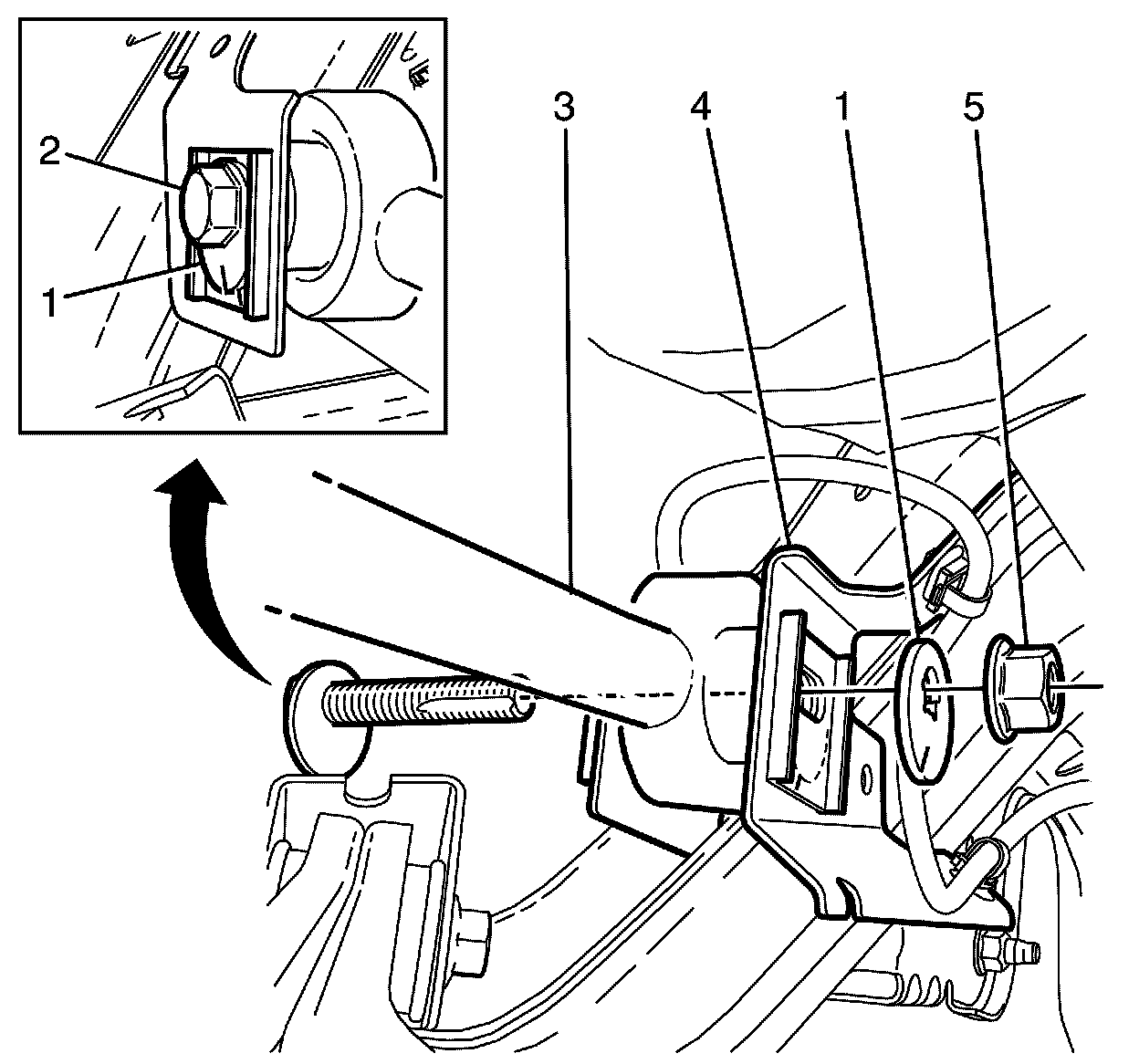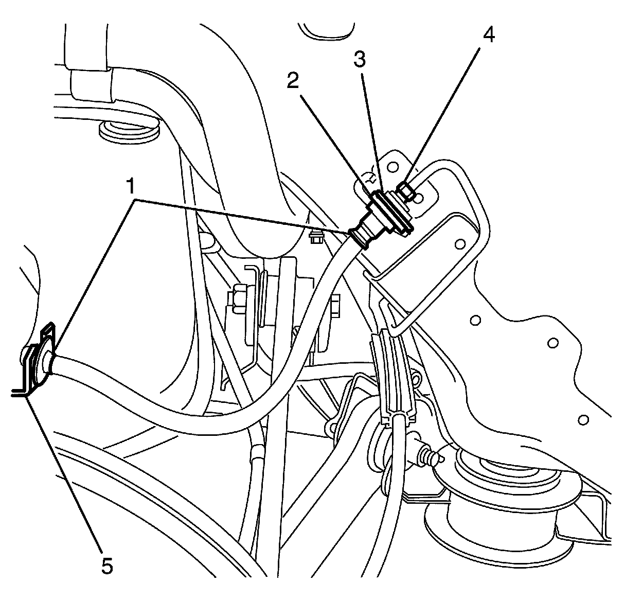 1.Attach the brake hose (1) from the upper control arm mounted brake hose retaining bracket (5).
