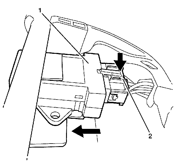 5. Press down the retaining clip (2) and pull the heated seat control module (1) away.
