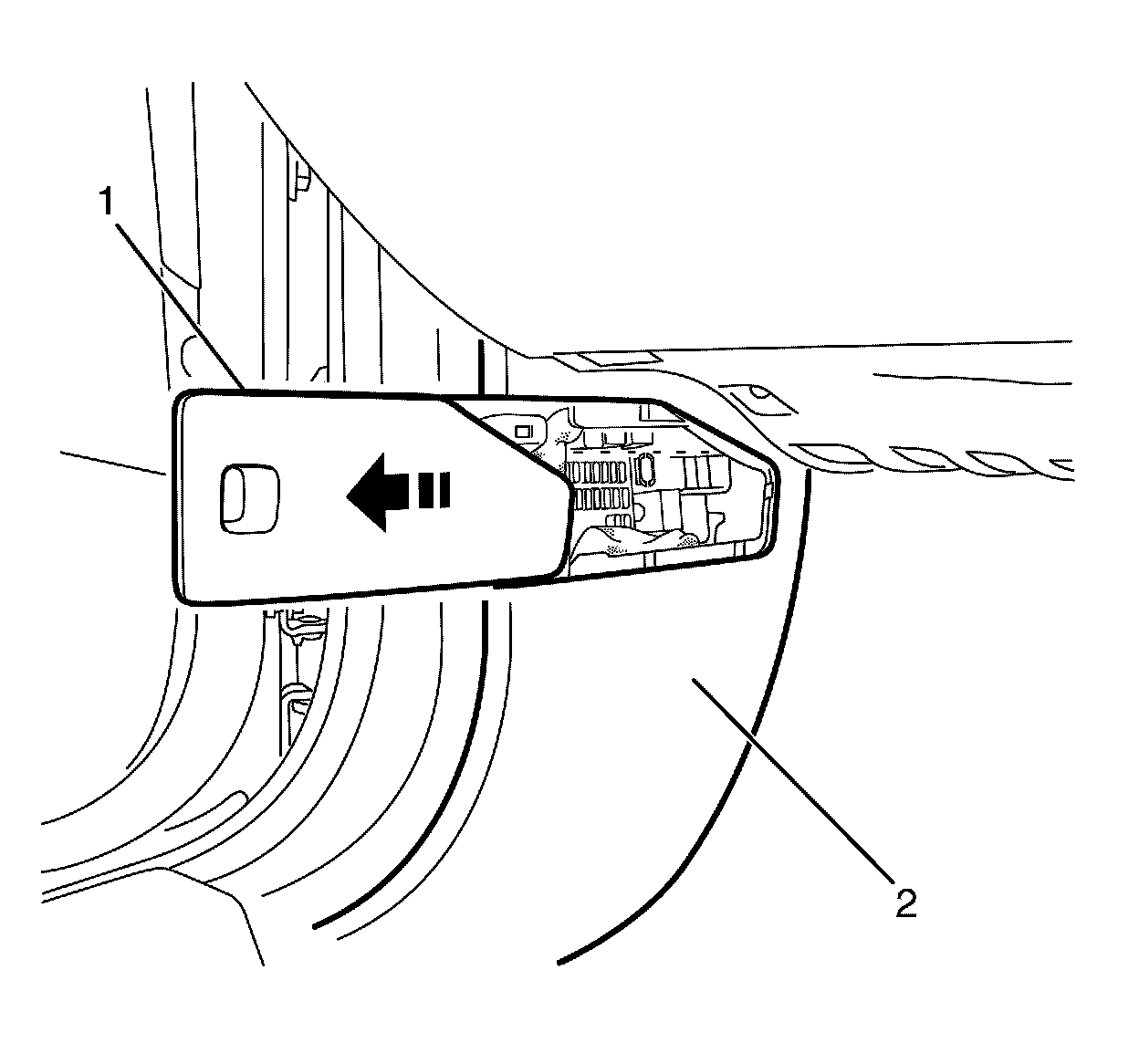 Important: Push the fuse block access cover (1) forward to engage it to the left hand hinge pillar trim (2).