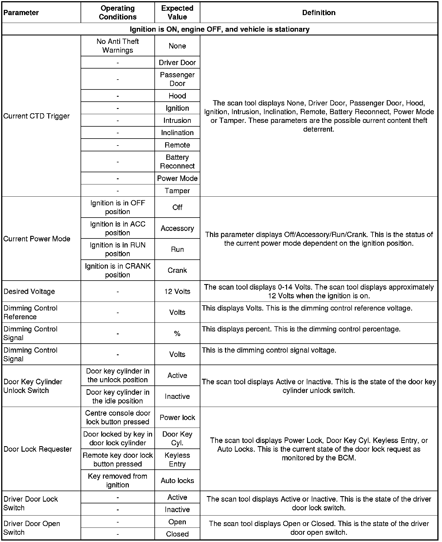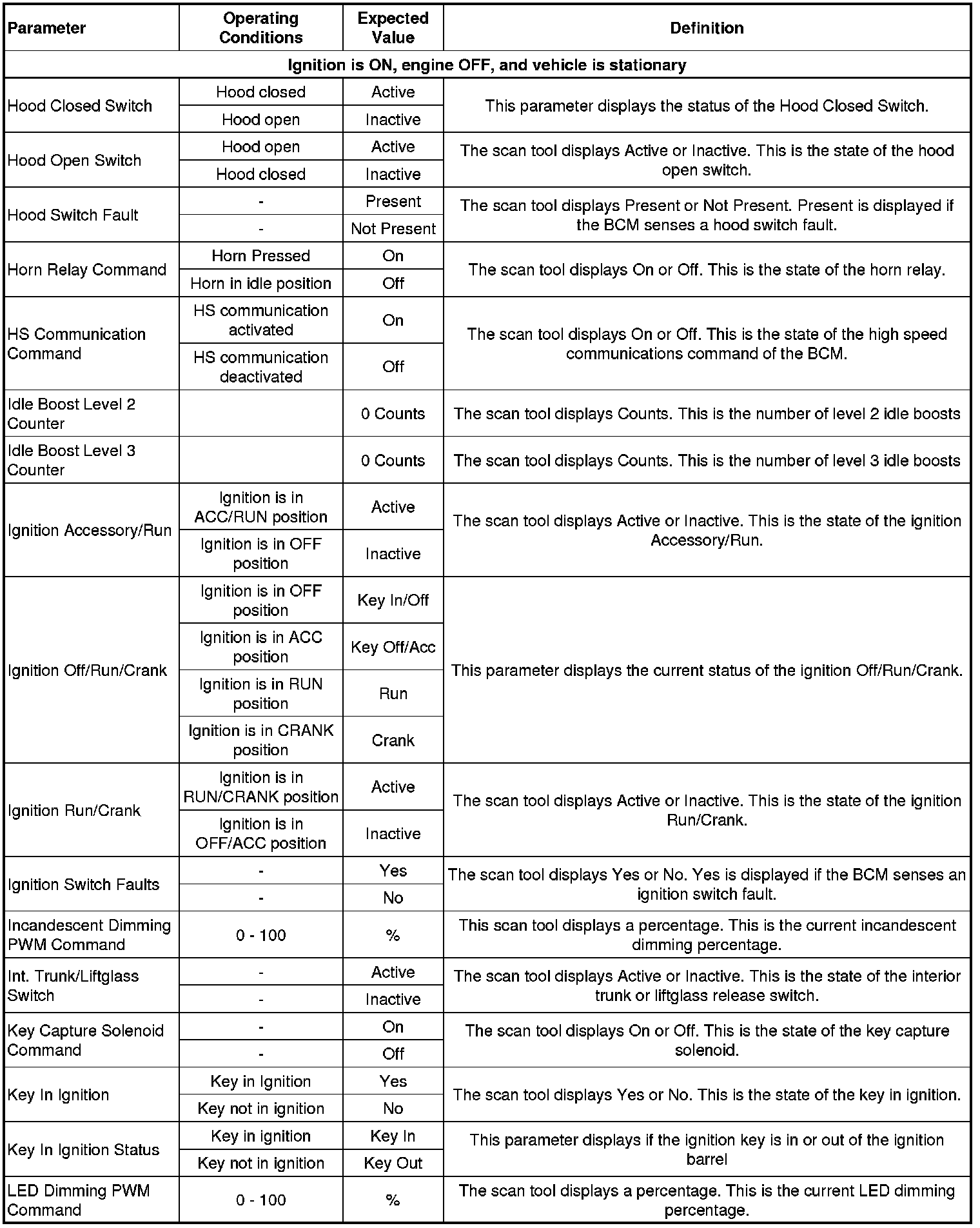 Body Control Module Scan Tool Data Parameters