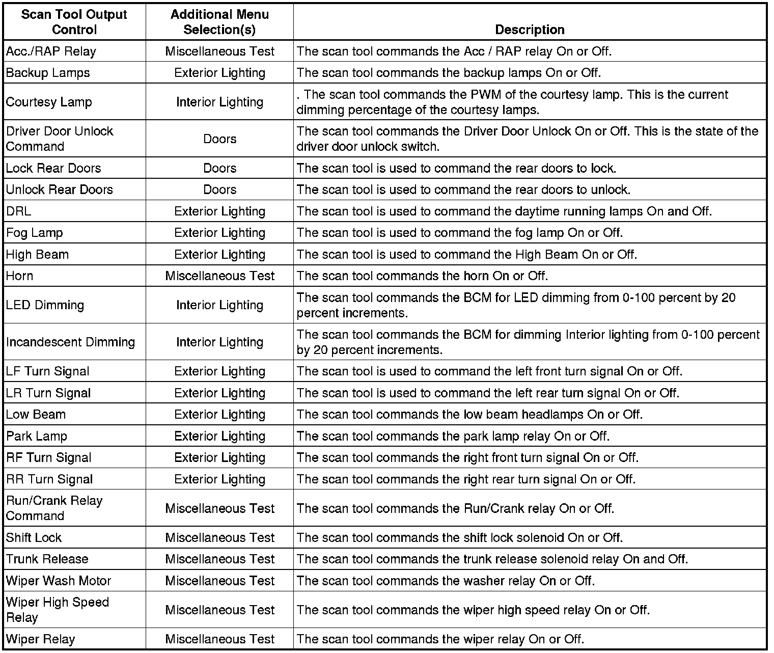Body Control Module Scan Tool Output Controls