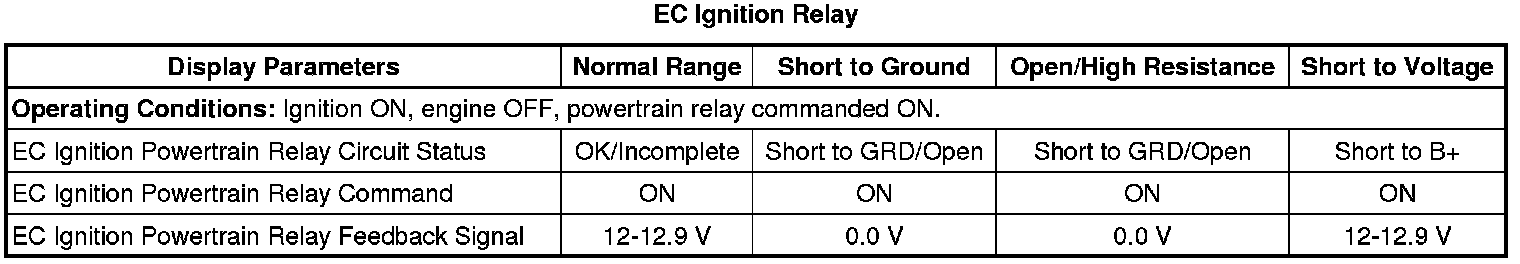 12. Ignition ON, engine OFF, monitor the EC Ignition Relay Feedback parameter with a scan tool. The parameter should display B+.