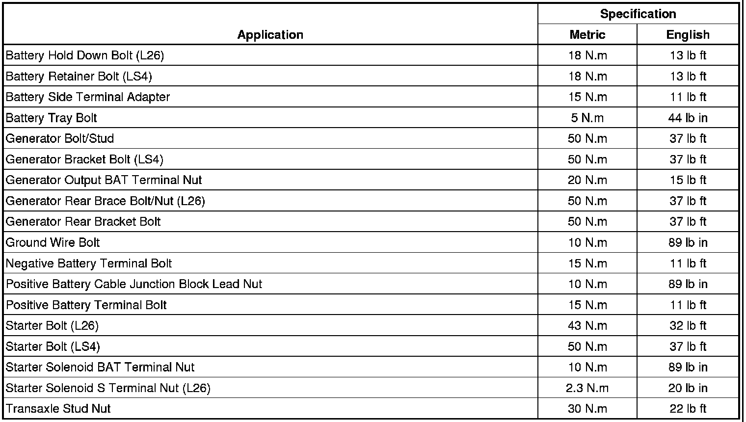 Starting and Charging: Specifications