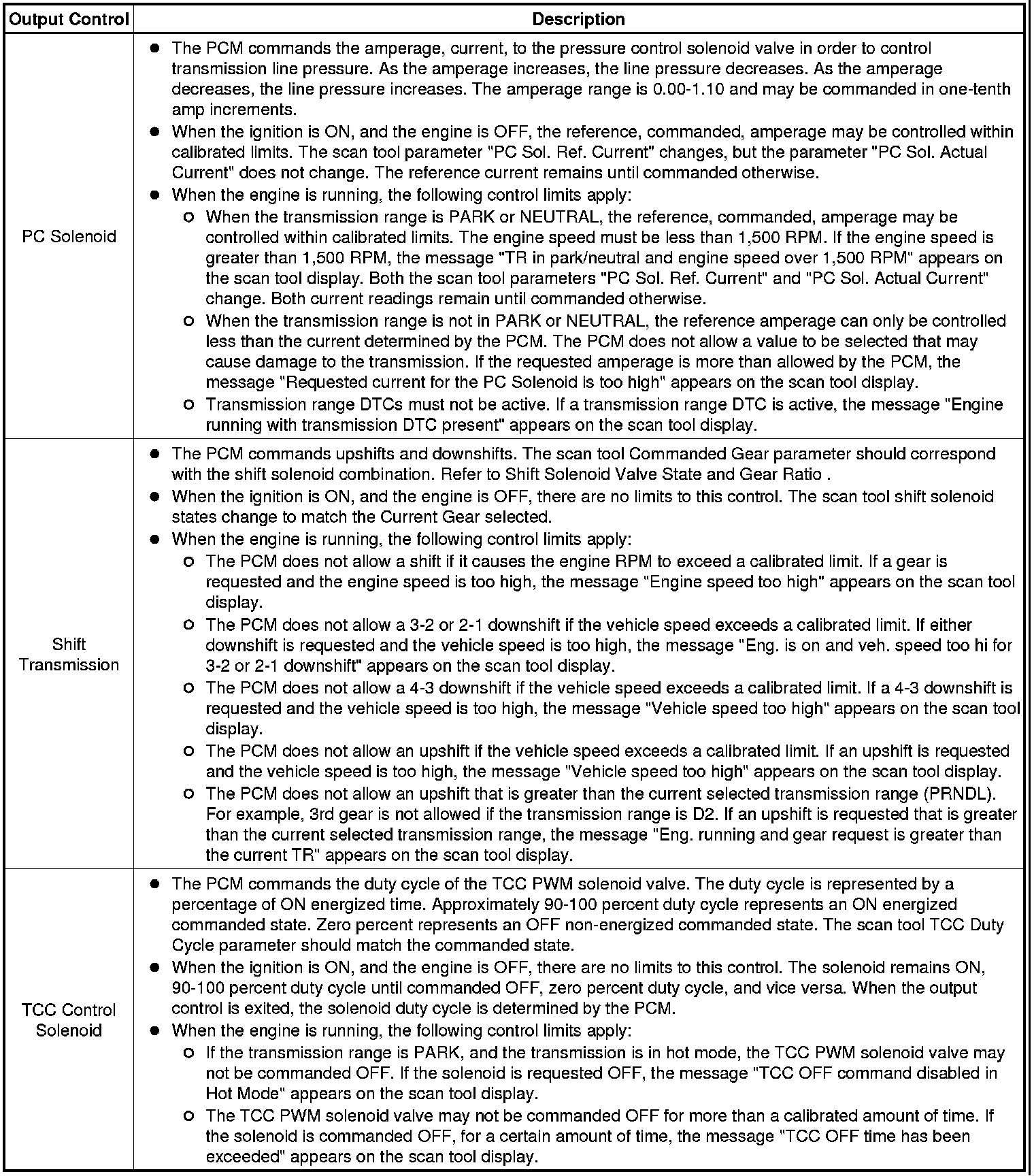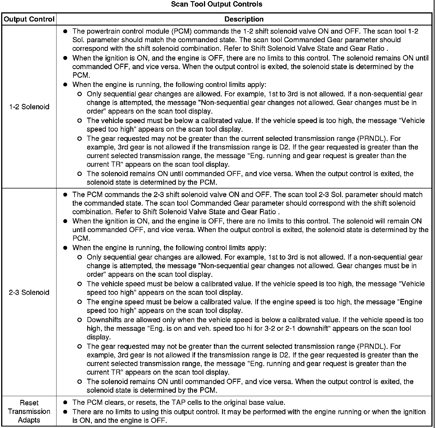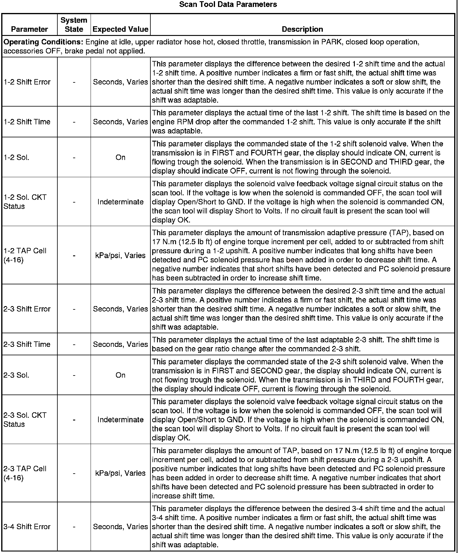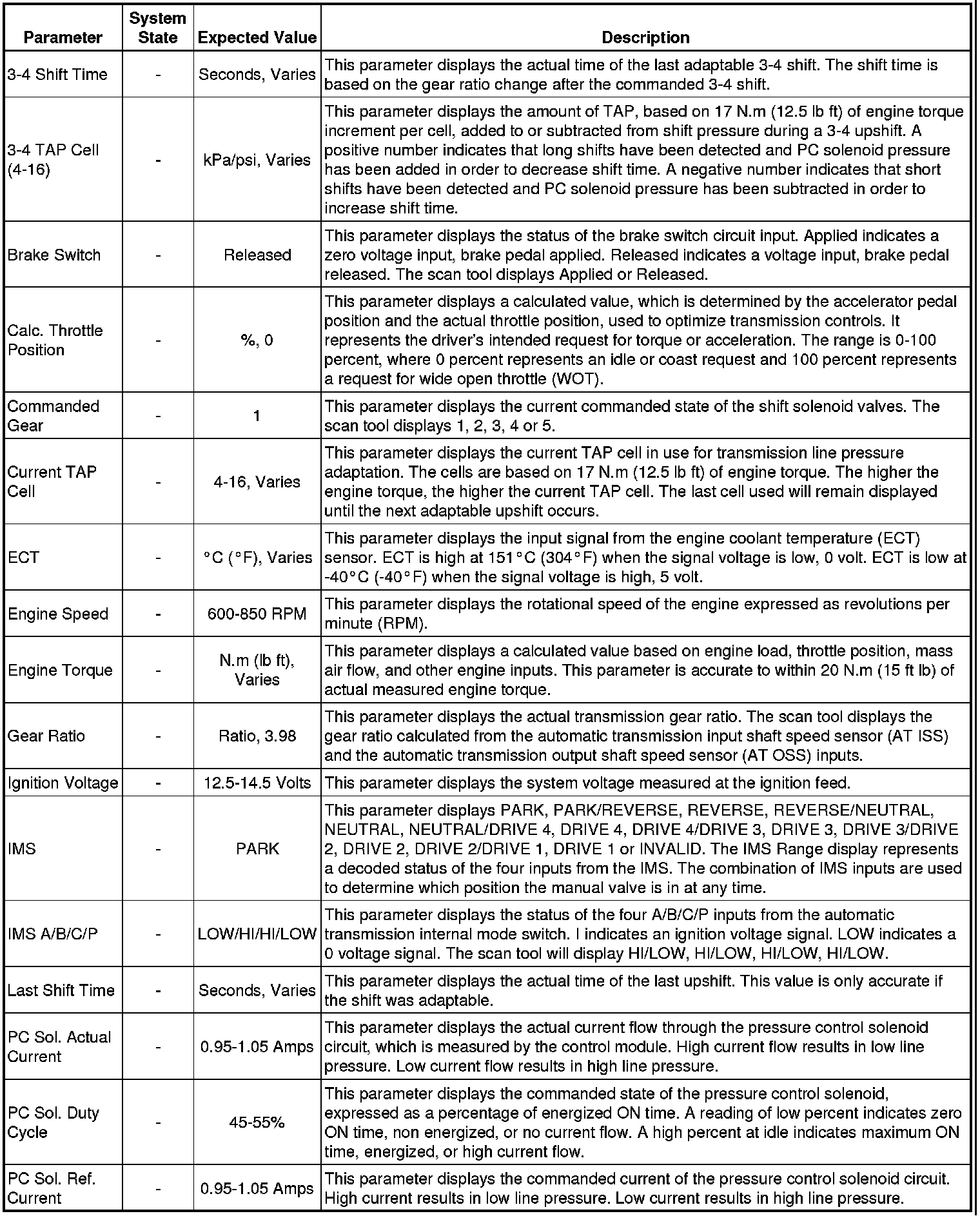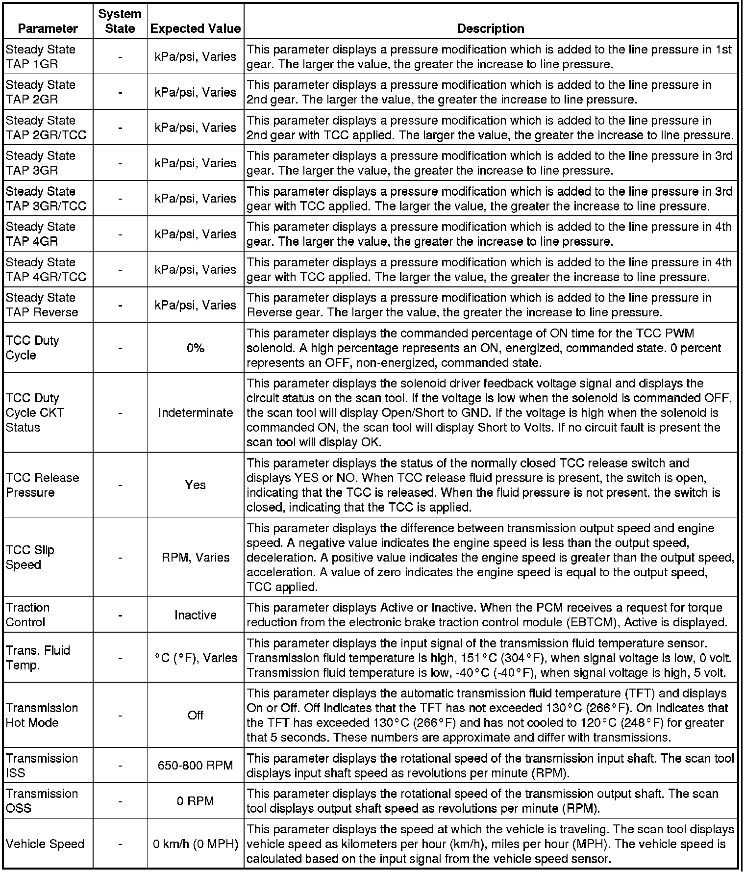 The Transmission Control Module Scan Tool Data List contains all transmission related parameters that are available on the scan tool. The list is arranged in alphabetical order. A given parameter may appear in any one of the data lists, and in some cases may appear more than once, or in more than one data list in order to group certain related parameters together.