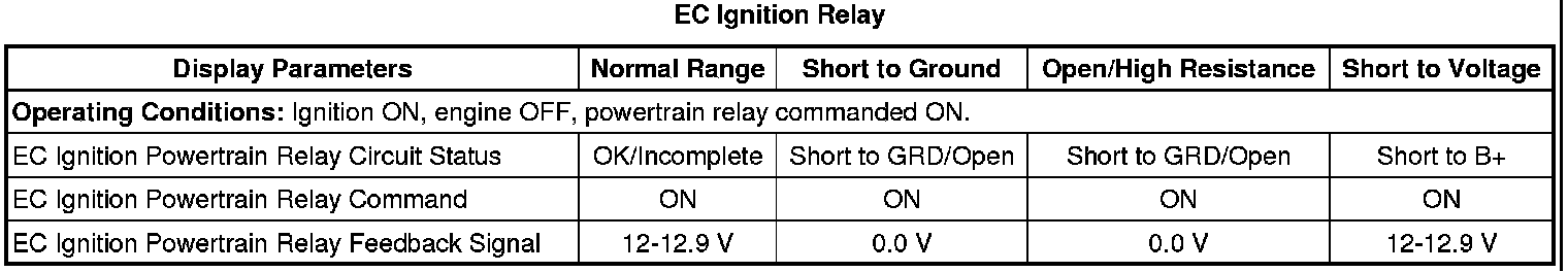 12. Ignition ON, engine OFF, monitor the EC Ignition Relay Feedback parameter with a scan tool. The parameter should display B+.