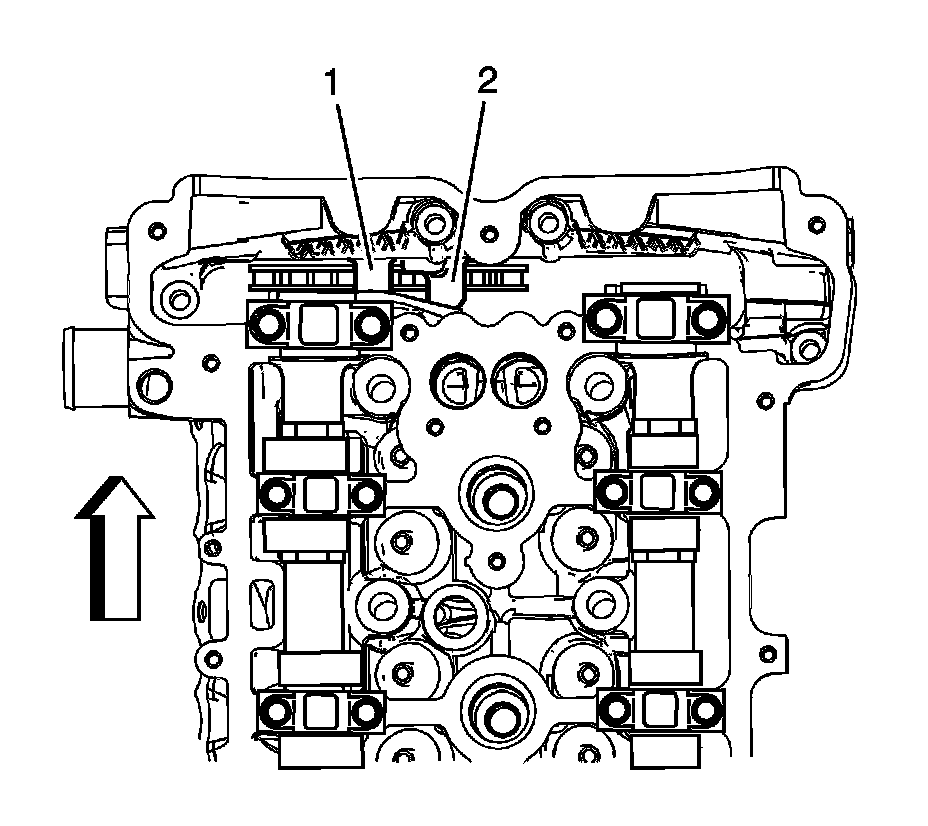 ^ Lower the timing chain through the opening in the cylinder head. Use care to ensure that the chain goes around both sides of the cylinder block bosses (1, 2).