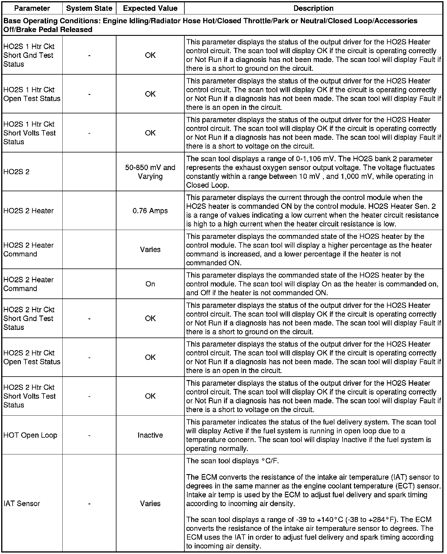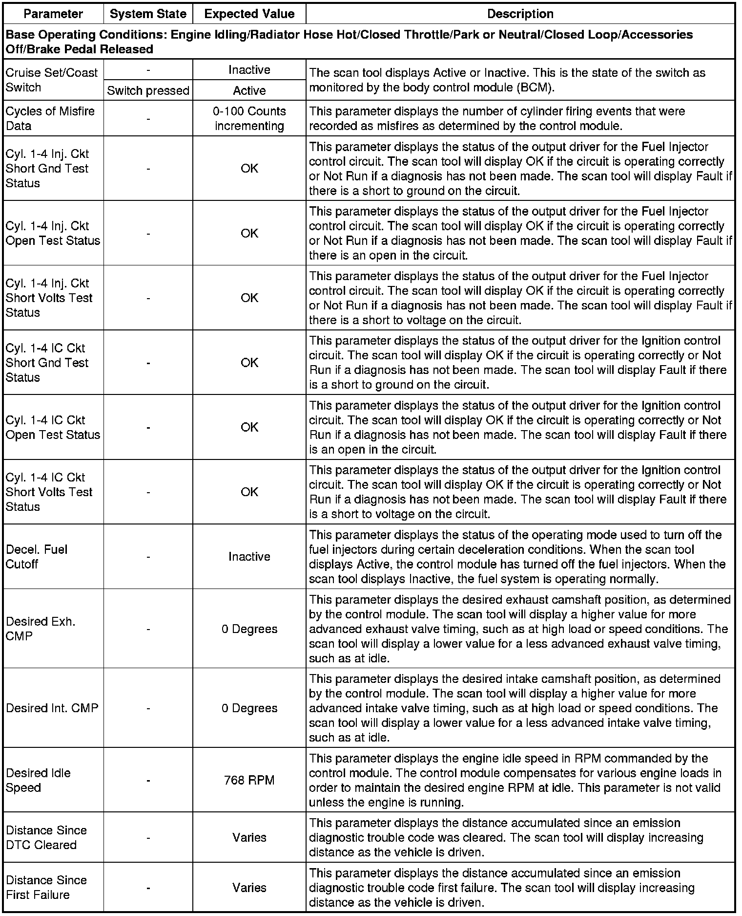 Only the parameters listed below are referenced in this service manual for use in diagnosis. If all values are within the typical range described below, refer to Symptoms - Engine Controls (- Symptoms - Engine Controls) for the 2.4L engine for diagnosis.