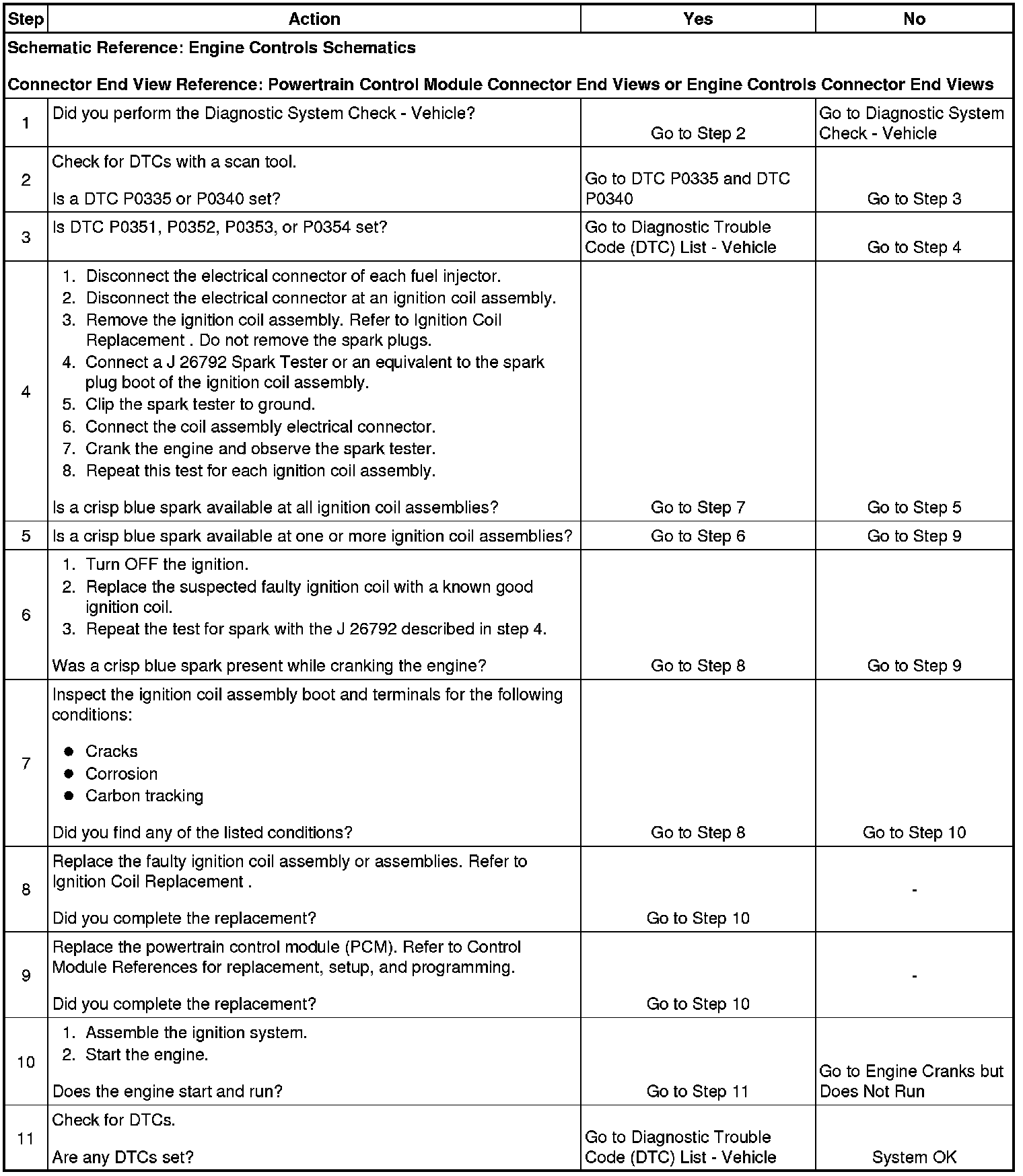 3. If there is a fault in the electrical circuits between the PCM and the ignition coil assemblies, a DTC P0351-P0354 will set. Use the DTC P0351-P0354 diagnostic table in order to repair the ignition system failure.