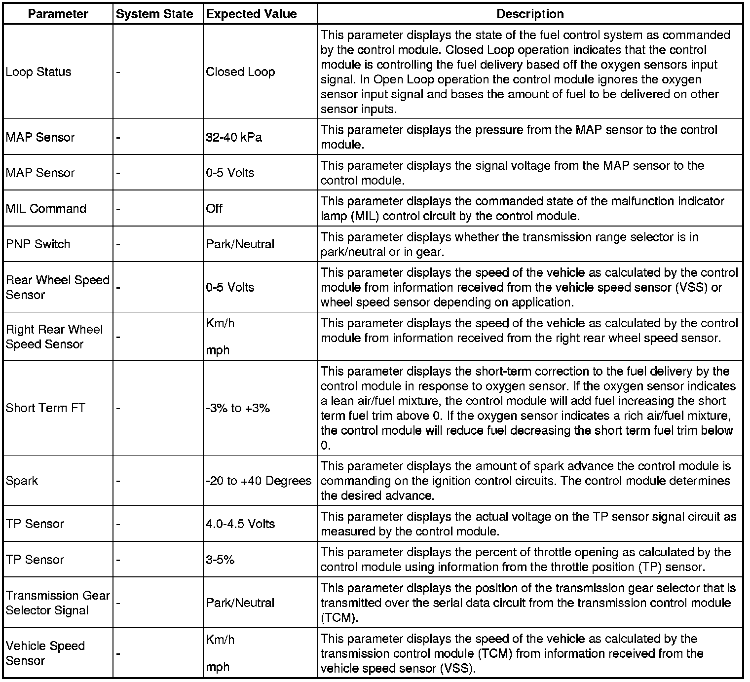 The scan tool values from a properly running engine may be used for comparison with the engine you are diagnosing. The Engine Scan Tool Data List represents values that would be seen on a normally running engine.