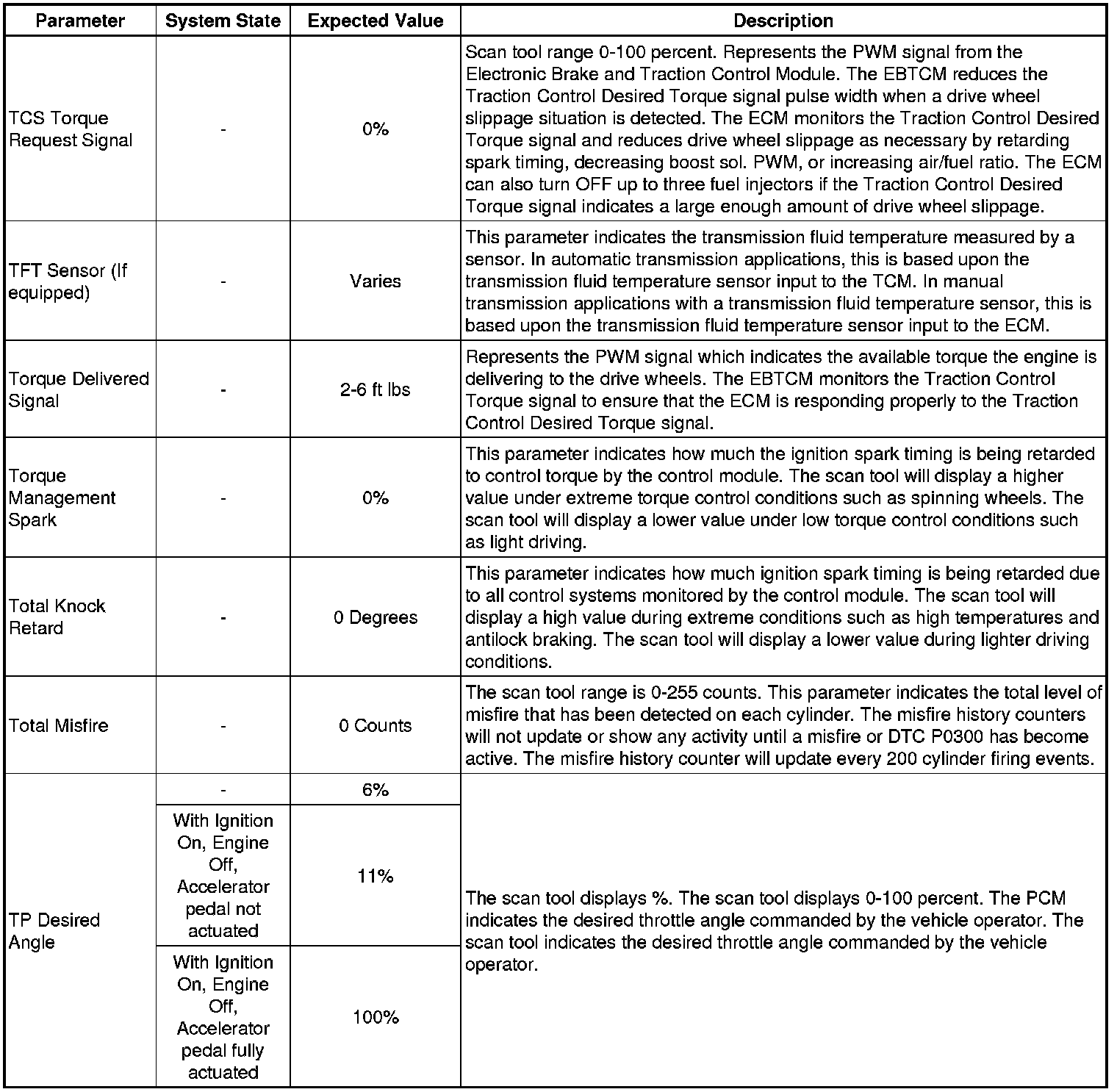 Only the parameters listed below are referenced in this service manual for use in diagnosis. If all values are within the typical range described below, refer to Symptoms - Engine Controls (- Symptoms - Engine Controls) for the 2.4L engine for diagnosis.